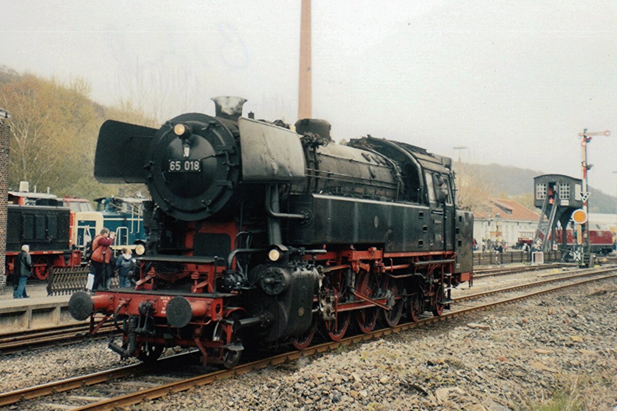 Der Legende lebt weiter! Als kletzte von nür achtzehn Tenderloks der Reihe 65 war 65 018 immer ins DDB-Werk Darmstadt im Einsatz bis die Ausmüsterung von Dampfloks bij die DB in 1977. Nach eine kurze weile is DDM kam sie 1981 zu der SSN in Rotterdam. Leider war die Wasserkapazität der Tenderlok nicht ausreichend für die Hauptbahnfahrten von der SSN (die keine eigene Strecke hat und nür eine Sammlung von Lokomotiven ist). In 2018 wurde mit der VSM vereinbart, das die 65 018 nach letztgenannte Organisation -die eine eigene Strecke besitzt- umgesiedelt wurde. Die 65 018 war beinahe jedes jahr eine gesehene Gast bei das Terug naar Toen Festival der VSM und die Kunft dieser machine war gleicherweise  überraschend und logisch. Hier lauft der Legende um in Apeldoorn am 4 September 2022.