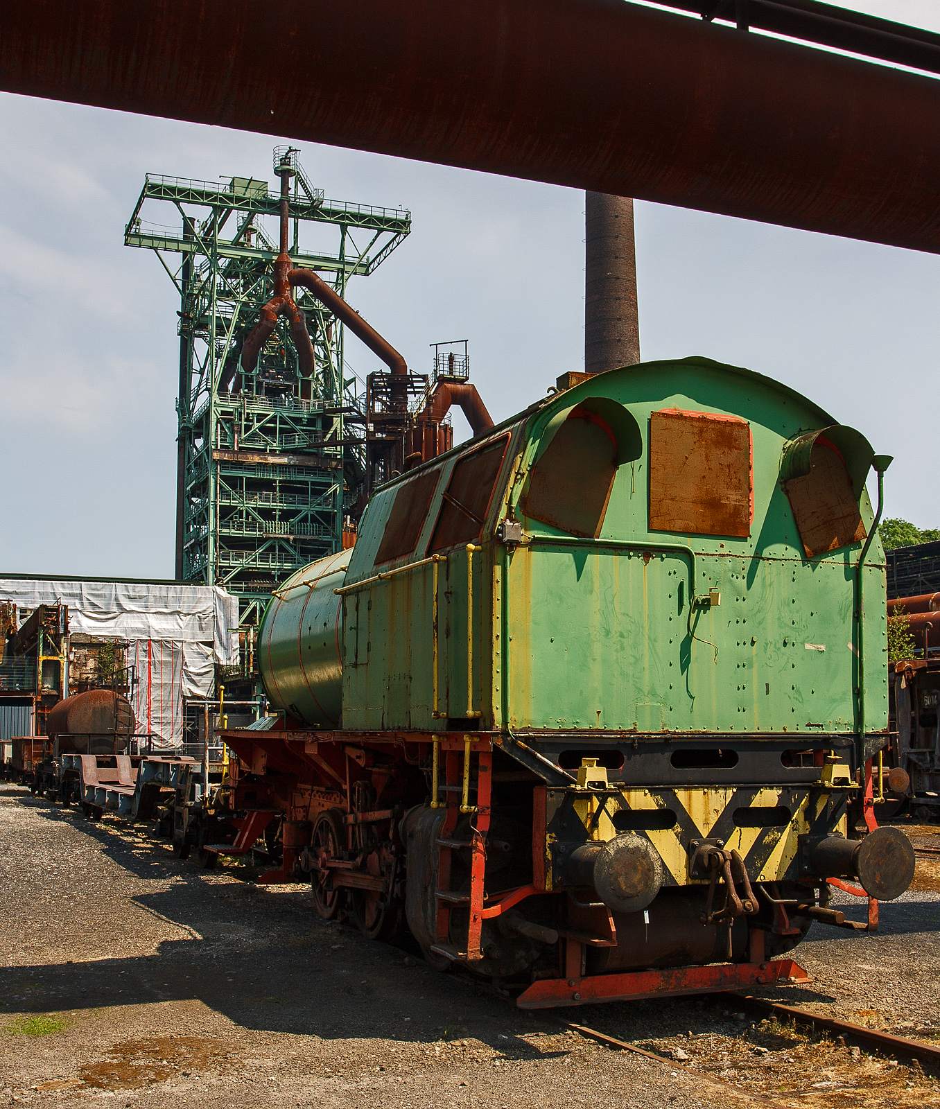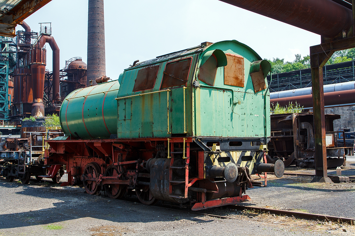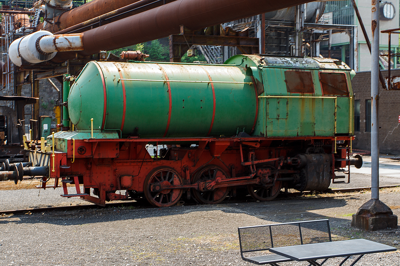 Die Dampfspeicherlokomotive, ex MRW - Mannesmannröhren-Werke AG Nr. 2, am 05 Juni 2011 im LWL-Industriemuseum Henrichshütte in Hattingen. Im Hintergrund der Hochofen 3 der ehem. Henrichshütte. Diese Lok wurde 1938 von Henschel in Kassel unter der Fabriknummer 24370, da war sie aber noch eine Kohle befeuerte Dampflok vom Henschel Typ Minister Stein. Sie wurde an die Mannesmannröhren-Werke AG ausgeliefert ging zum Einsatz an die Zeche Consolidation in Gelsenkirchen, dessen Eigentümer die MRW war. Im 1958 ging die Lok zum Umbau an die Henschel-Werke GmbH in Kassel, wo sie dann in eine Dampfspeicherlok (System Gilli) umgebaut wurde. Den neuen Kessel stellten die Mannesmannwerke (Fabriknummer 68957-2 / Bj. 1958) bei. Nach dem Umbau ging es wieder zurück an die Mannesmann AG, bis sie 1970 zur RAG - Ruhrkohle AG (BAG Gelsenkirchen) kam und als D-502 bezeichnet wurde. 1974 wurde sie an die Rütgers-Werke AG in Castrop-Rauxel verkauft, wo sie noch bis 1993 lief. Im Jahr 1997 ging an das WIM - Westfälisches Industriemuseum (Henrichshütte in Hattingen), seit 2007 LWL Industriemuseum Westf. Landesmuseum für Industriekultur. Dampfspeicherlokomotiven: Die feuerlose Lokomotive behielt lediglich das Fahrwerk. Die Aufbauten wurden gedreht, das Führerhaus wurde über den Zylindern und der Kessel davor aufgebaut. Technisch war es eine Hochdruckspeicherlokomotive mit einem Dampfdruck von 50 bar (50 kg/cm²) im Kessel. Entworfen war dieses System nach Prof. Gilli. Die Dampfspeicherlok wird zu 2/3 (hier 12,51 m³) mit siedendem Wasser gefüllt und dann mit hohem Dampfdruck beaufschlagt. Durch das druckdichte System überhitzt der Dampf das Wasser (bei 25 bar Dampfdruck beträgt die Wassertemperatur 224°C). Im Betrieb wird zunächst der zugeführte Dampf verbraucht. Da das Wasser aber überhitzt ist, wird stetig neuer Dampf erzeugt. Der aus dem Hochdruck entnommene Dampf wird auf den Betriebsdruck von 13 bar reduziert und dann der Dampfmaschine (den beiden Zylindern) zugeführt. In einer 8h-Schicht brauchte die Lok drei Füllungen. Höchstleistung mit einer Füllung waren so 354 t auf 12,2 km. TECHNISCHE DATEN nach Umbau: Spurweite: 1.435 mm (Normalspur) Gesamtradstand 3.100 mm Treibrad-Ø: 1.100 mm (neu) Zylinder-Ø: 540 mm Wasserraum: 12,51 m³ Dampfraum: 1,4 m³ Speicherdruck: 50 kg/cm Arbeitsdruck: 13 kg/cm Zugkraft: 14.250 kg Leergewicht: 46.620 kg Dienstgewicht: 56.215 kg