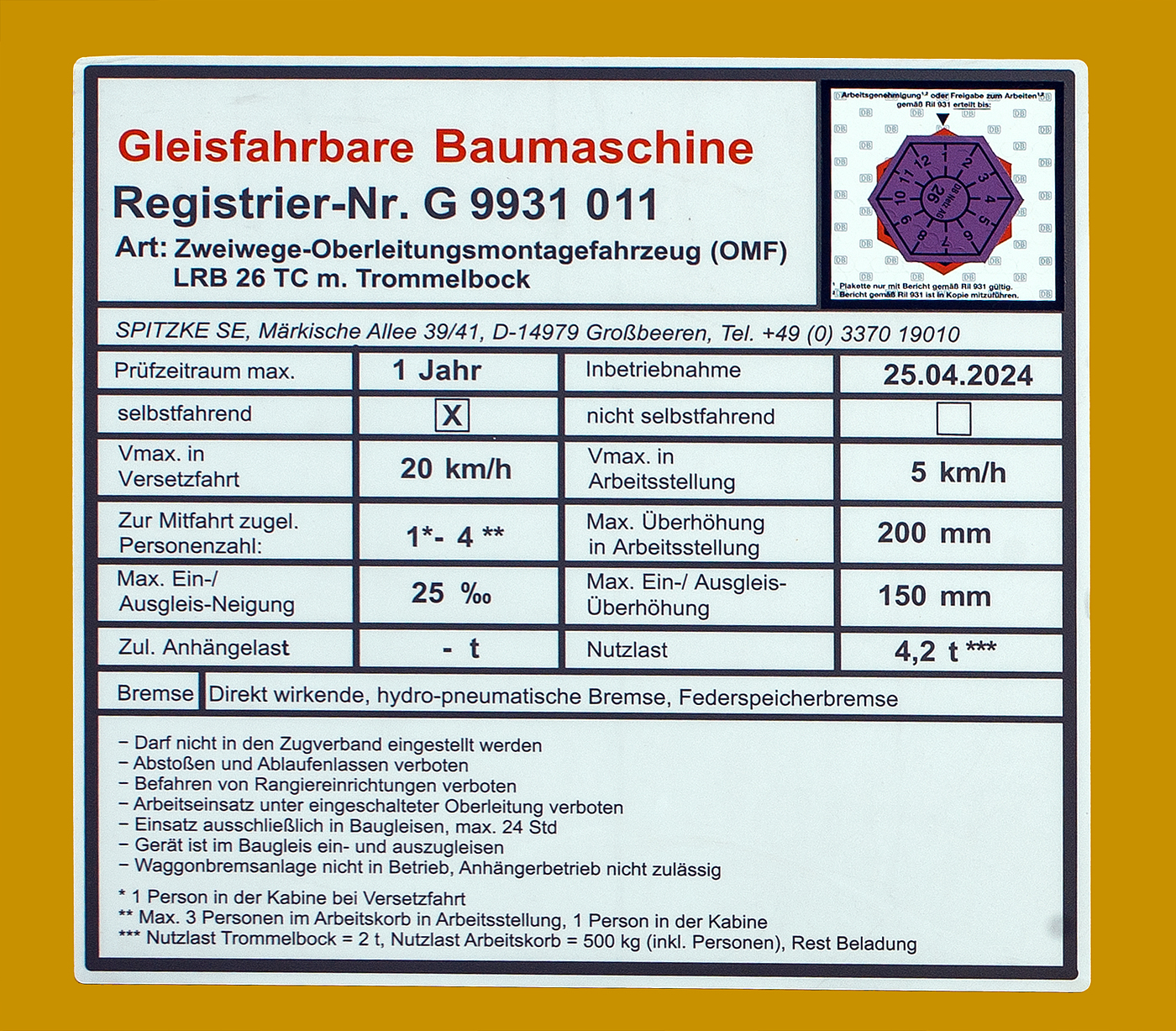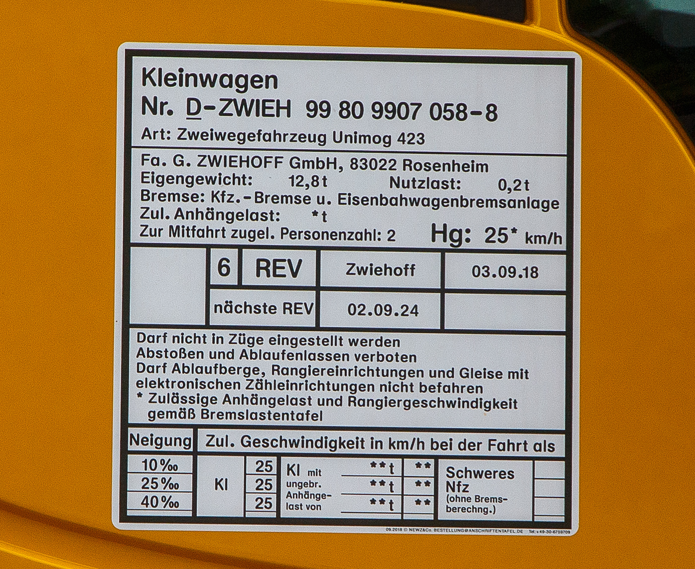 Anschriftentafel von dem Liebherr Zweiwegebagger A 922 Rail Litronic mit Abstützpratzen, interne Nr. LH 12 der BBL Maschinentechnik GmbH (Lüneburg), eigestellt durch die SES Aus- und Fortbildung e.K. (Horst / Holstein) unter der Kleinwagen Nr. D-SESAF 99 80 9904 303-1, abgestellt am 26.08.2023 in Herdorf (Ostweg) beim Lokschuppen der KSW, Betriebsstätte FGE -Freien Grunder Eisenbahn.