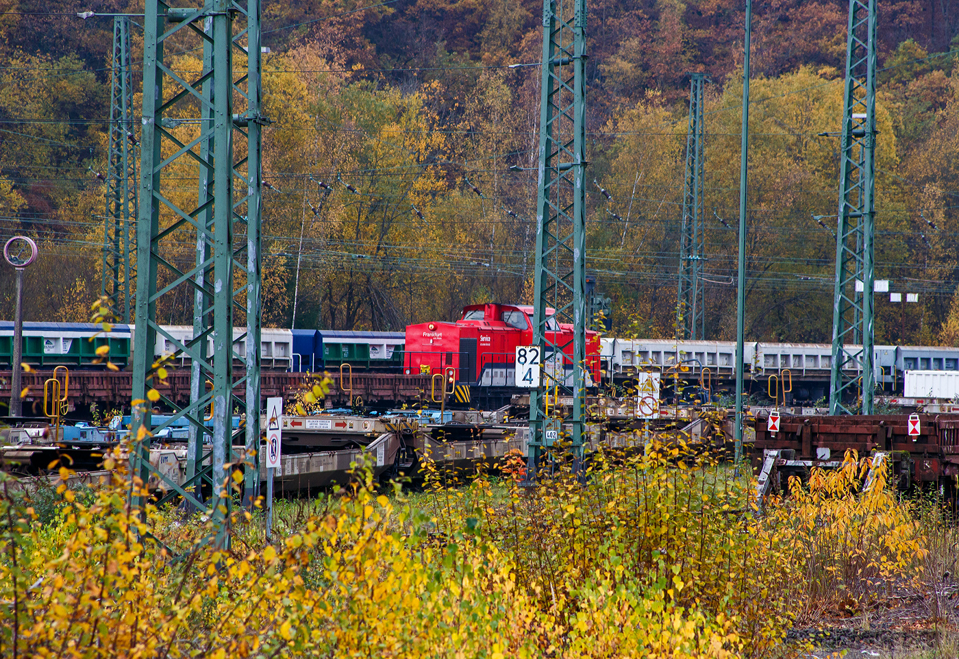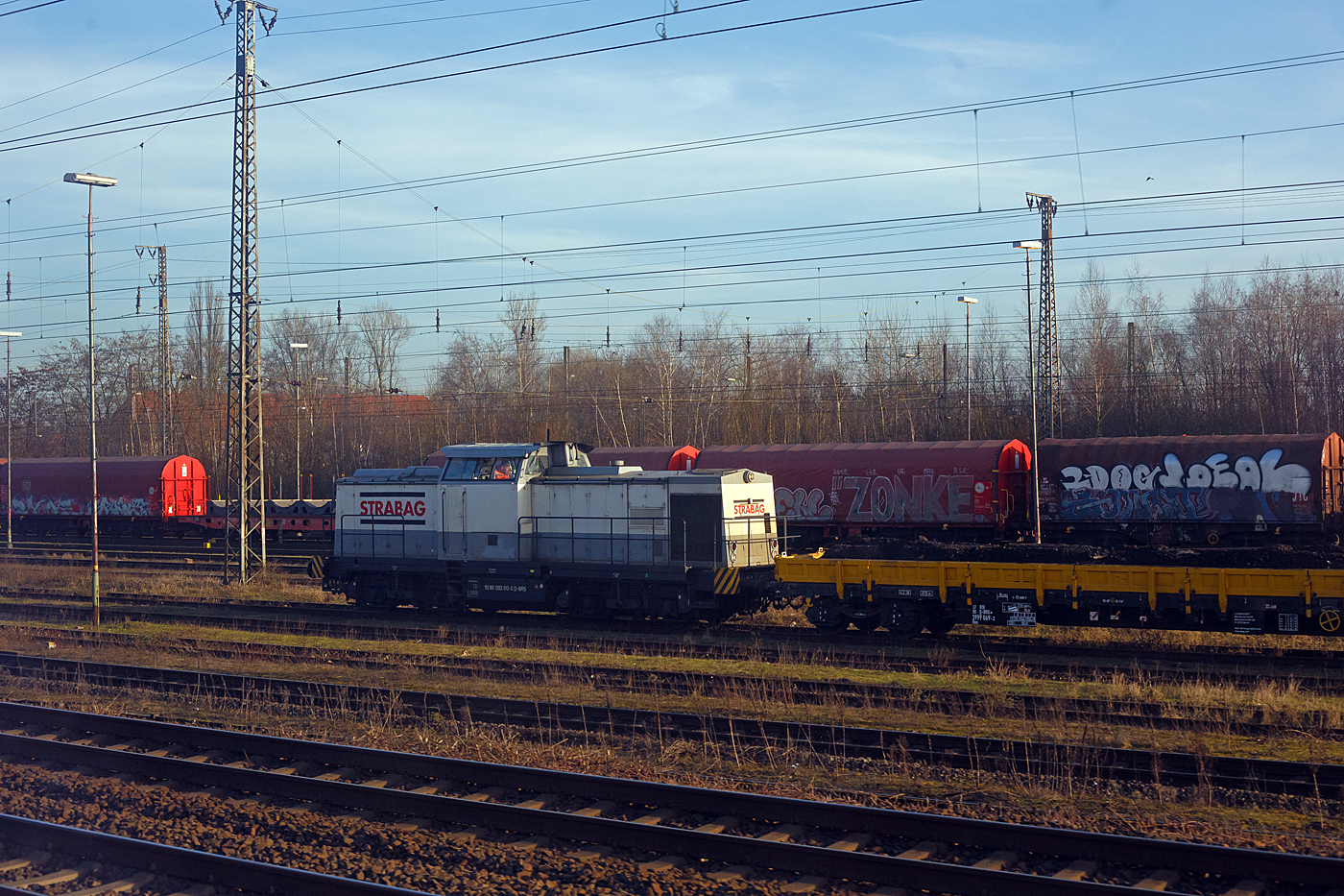 Die 203 306-6 (92 80 1 203 306-6 D-DB) der DB Netz AG, ex DB 202 752-2, ex DR 112 752-1, ex DR 110 752-3, steht am 04.06.2019 mit Abraumwagen (Containertragwagen 2 Abraumcontainer) beim Stellwerk Stuttgart Nord (aufgenommen aus einem Zug).