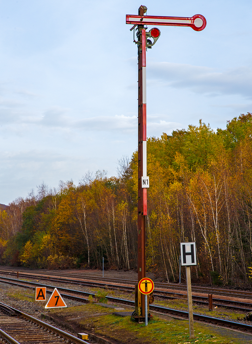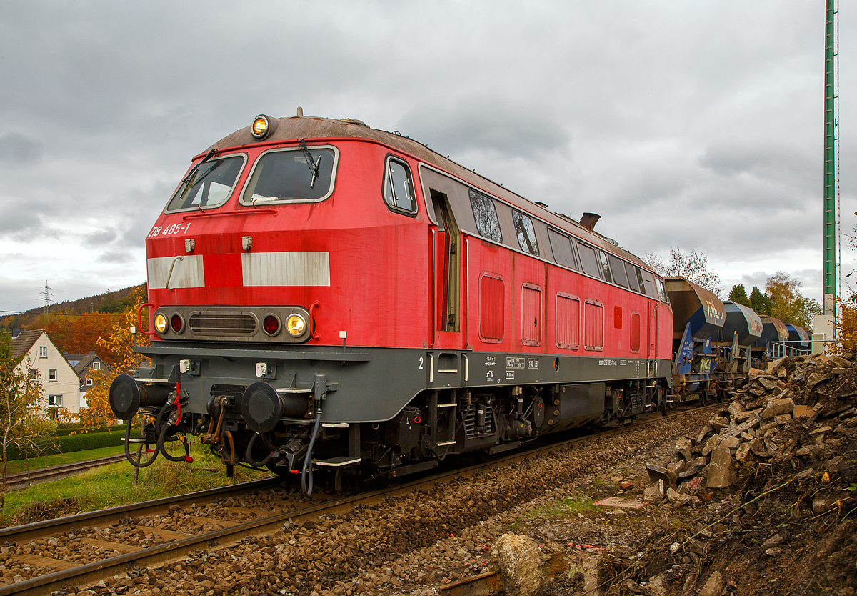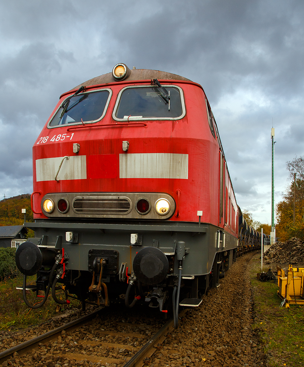Die 218 485-1 (92 80 1218 485-1 D-AIX) der AIXrail GmbH ist am 20.10.2020 mit einem Flachwagenzug im Bahnhof Herdorf. Der Wagenzug wird später mit Altschotter beladen.