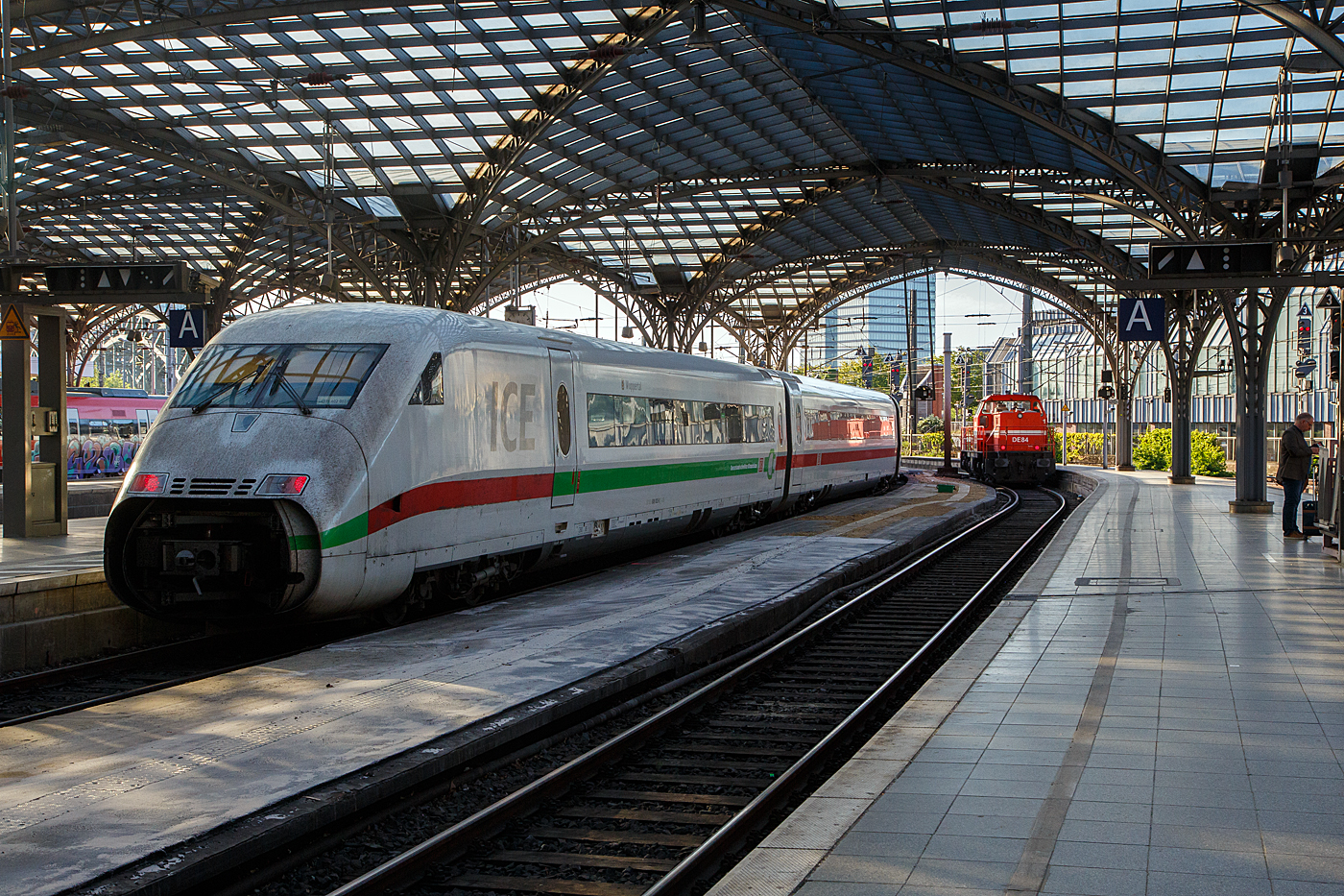 Die RheinCargo DE 84 (98 80 0272 022-1 D-RHC), ex HGK DE 84, eine MaK DE 1002, sowie ein ICE 2 verlassen am 14 Mai 2022 den Hauptbahnhof Köln.