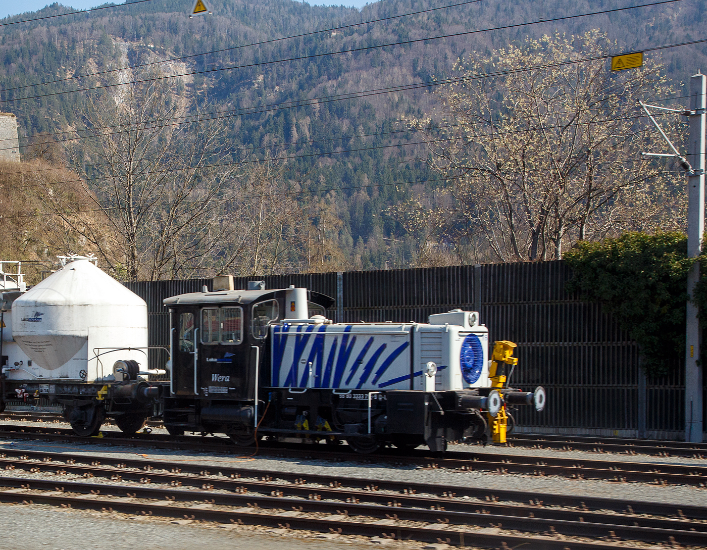 Ein Blick aus unseren EC 86, die Zebra-Köf III (mit Gelenkwellen) 333 716-9 „Wera“ (98 80 3333 716-9 D-LM) der Lokomotion Gesellschaft für Schienentraktion mbH, ex DB 335 216-8, ex DB 333 216-0, steht am 28 März 2022 mit einem kurzen Güterzug bei der Lokomotion Lokwerkstatt in Kufstein.