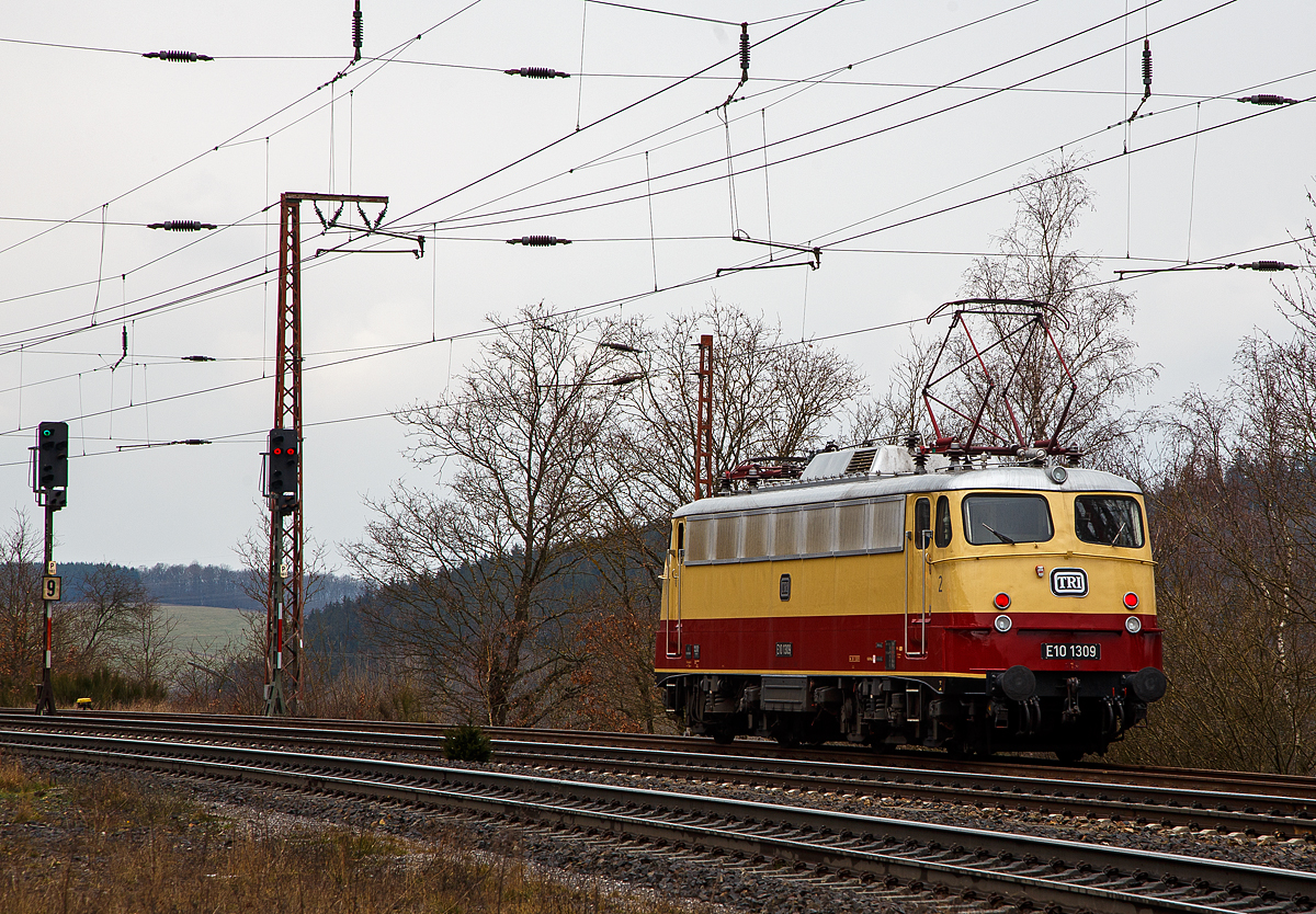 Die TRI E10 1309 (91 80 6113 309-9 D-TRAIN) der Train Rental International GmbH hat am 18.03.2021 als Lokzug in Rudersdorf (Kr. Siegen), an der Dillstrecke (KBS 445), Hp 0. Sie muss erst einen Güterzug überholen lassen.