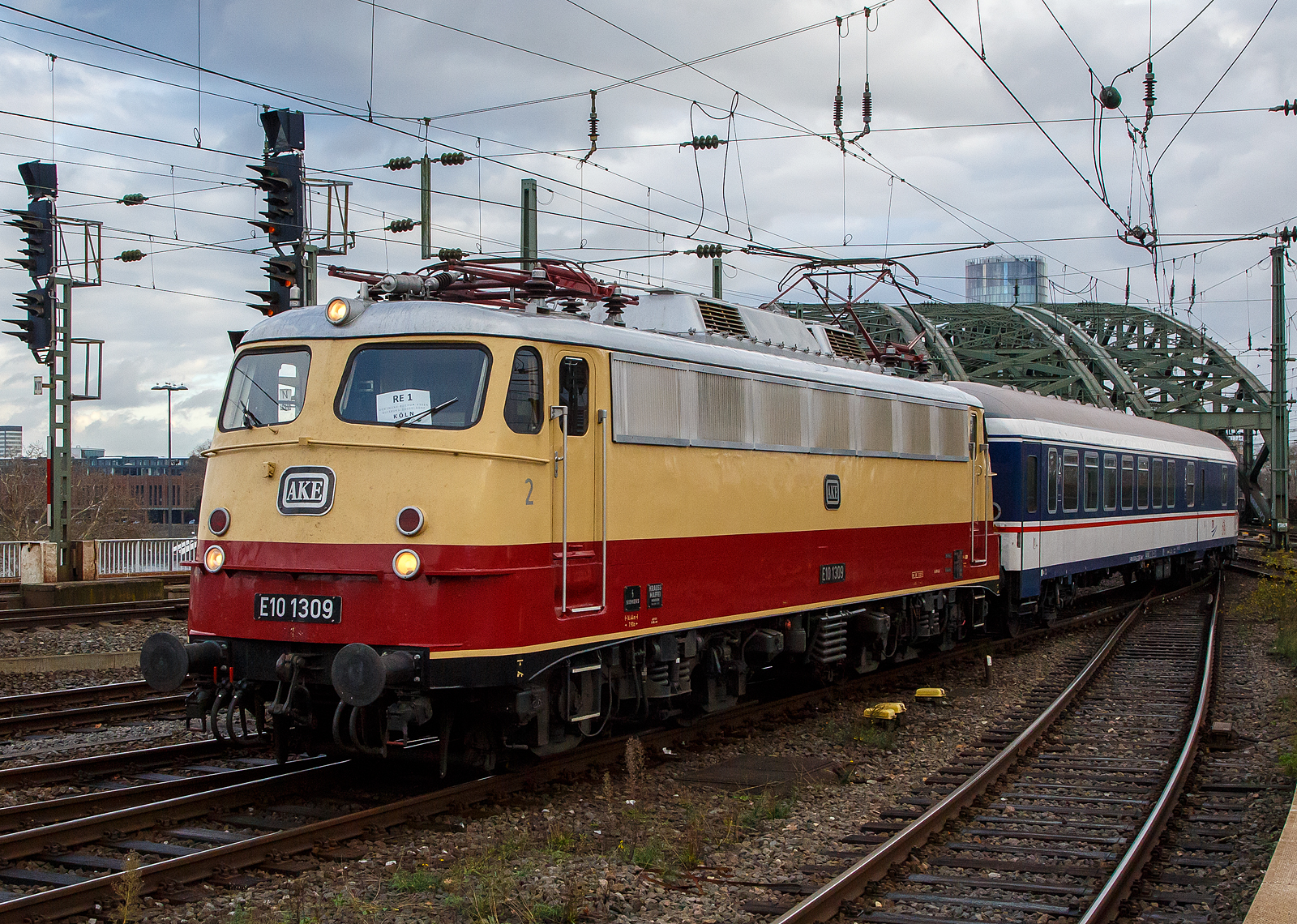 Die AKE E10 1309 (91 80 6113 309-9 D-TRAIN) der Train Rental International GmbH mit n-Wagen als National Express Verstärker des RE 1 "Nordrhein-Westfalen-Express" Dortmund Hbf – Köln Hbf, erreicht am 22.12.2018 den Hauptbahnhof Köln.
