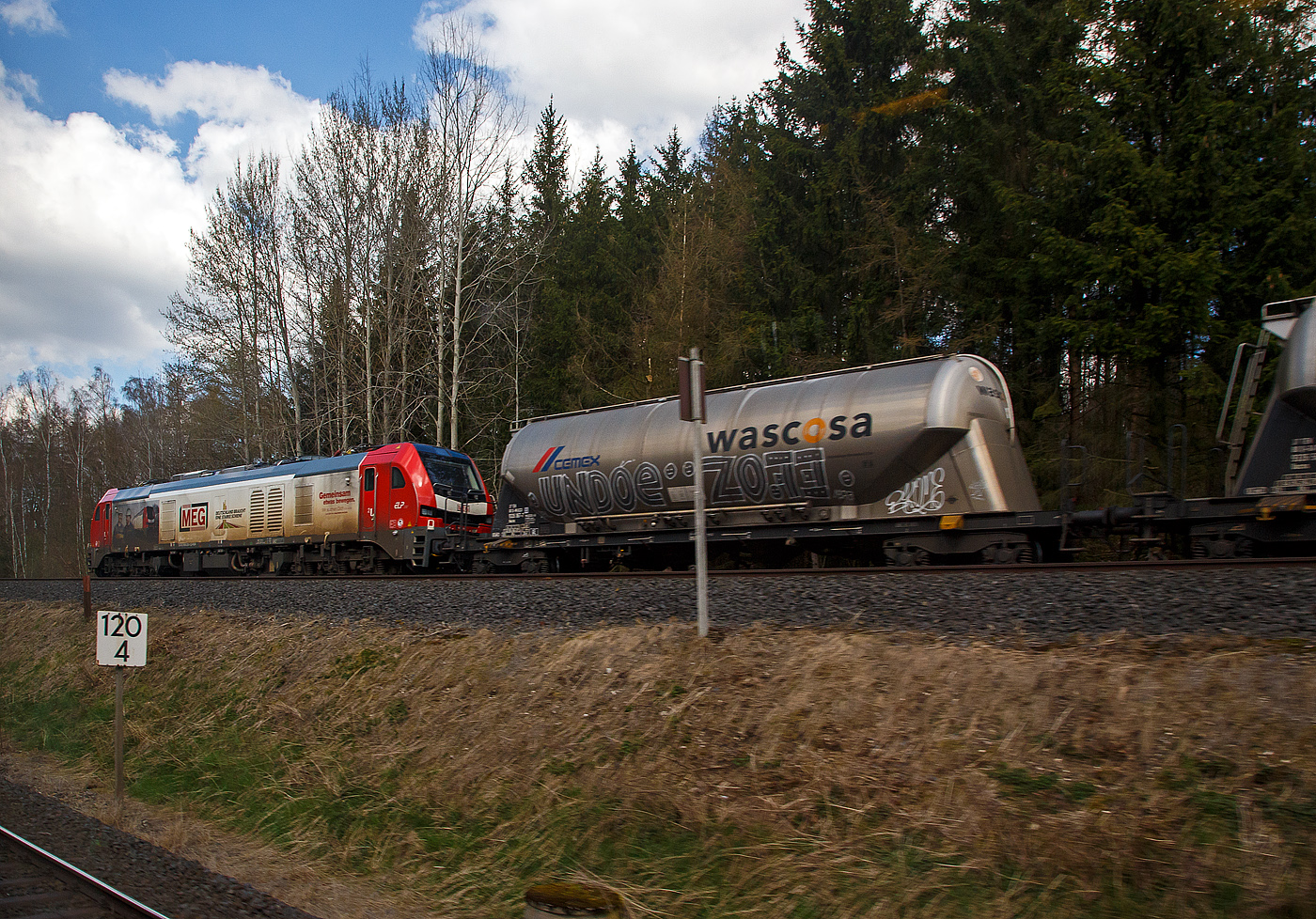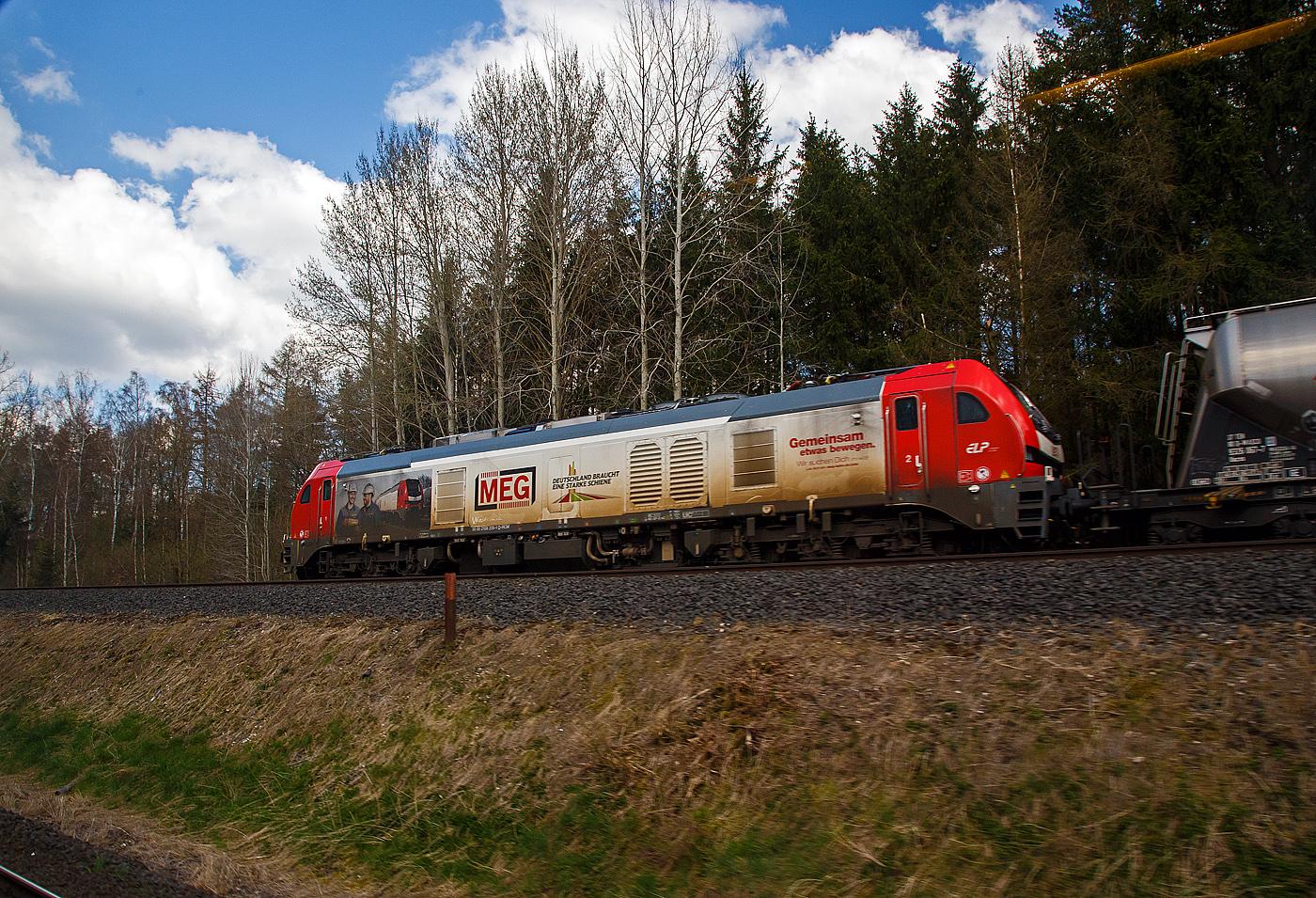 Die an die MEG vermietete145 067-5 (91 80 6145 067-5 D-DB) der DB Cargo AG fährt am 29.04.2021, mit einem Stahlzug-Zug (Coils und 4kt-Knüppel), durch den Bahnhof Betzdorf (Sieg) in Richtung Siegen.