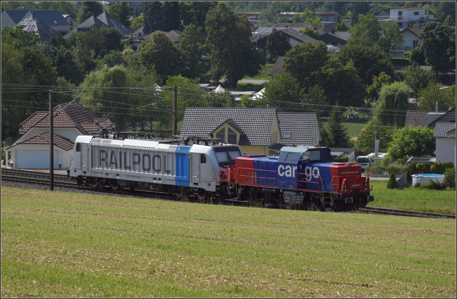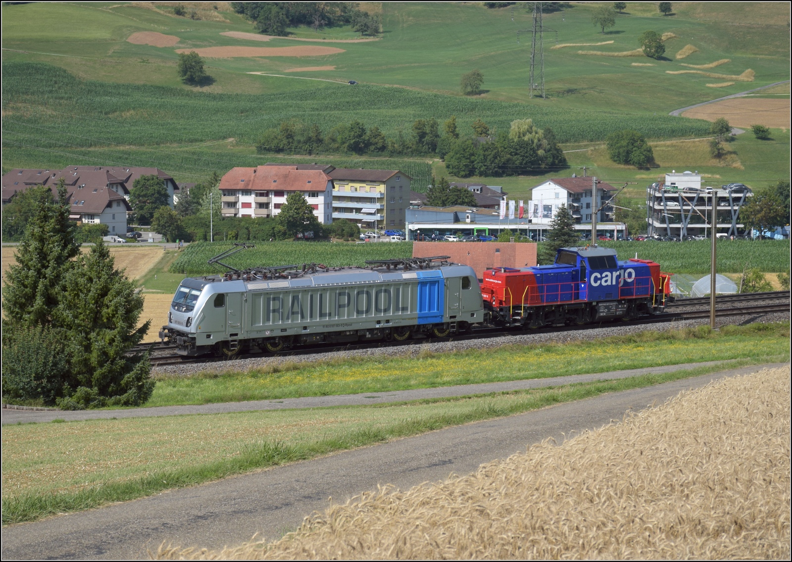 Railpool 187 005-4 fährt in Weinfelden mit einem UKV Zug vor der Brauerei Feldschlösschen vorüber.Bild Juni 2015