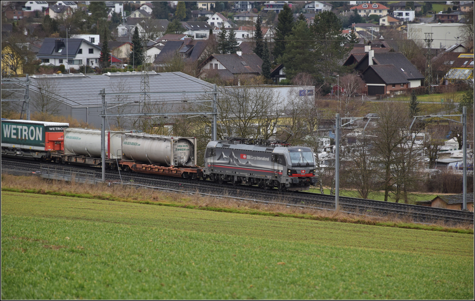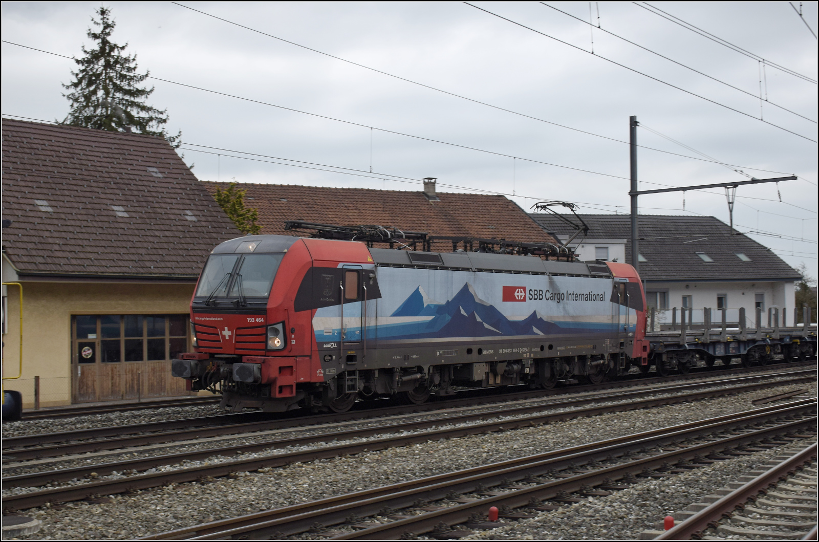 SBB CARGO INTERNATIONAL: Die beiden Vectron 193 902-4 und 193 209-4 (SBB) mit einem ehemaligen SBB-Speisewagen in Burgdorf bei der Weiterfahrt zur SOB für weitere Versuchsfahrten. Mehrere Versuchsfahrten fanden in der Woche 26 bereits auf der Strecke Bern-Schwarzenburg statt. Ich gehe davon aus, dass man die SBB CARGO LOK nicht oft in der Schweiz fotografieren kann.
