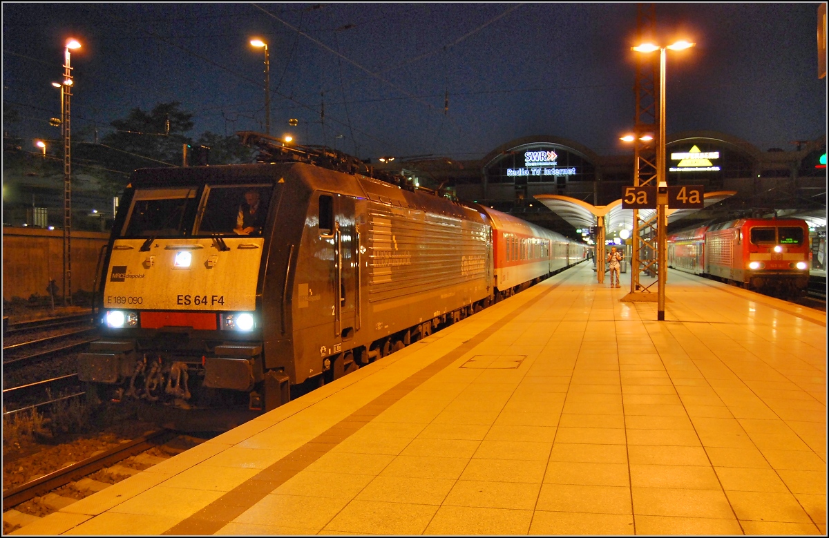 An einem Maiabend 2012 durchfährt eine unbekannte 101 mit dem CNL 472 Basel-Kopenhagen Bad Krozingen. Hinter der Lok sind zwei Kurswagen von Basel nach Moskau eingestellt. Diesen Langlauf gab es bis zum Fahrplanwechsel 2013/2014, inzwischen ist auch die Verbindung nach Kopenhagen Geschichte.