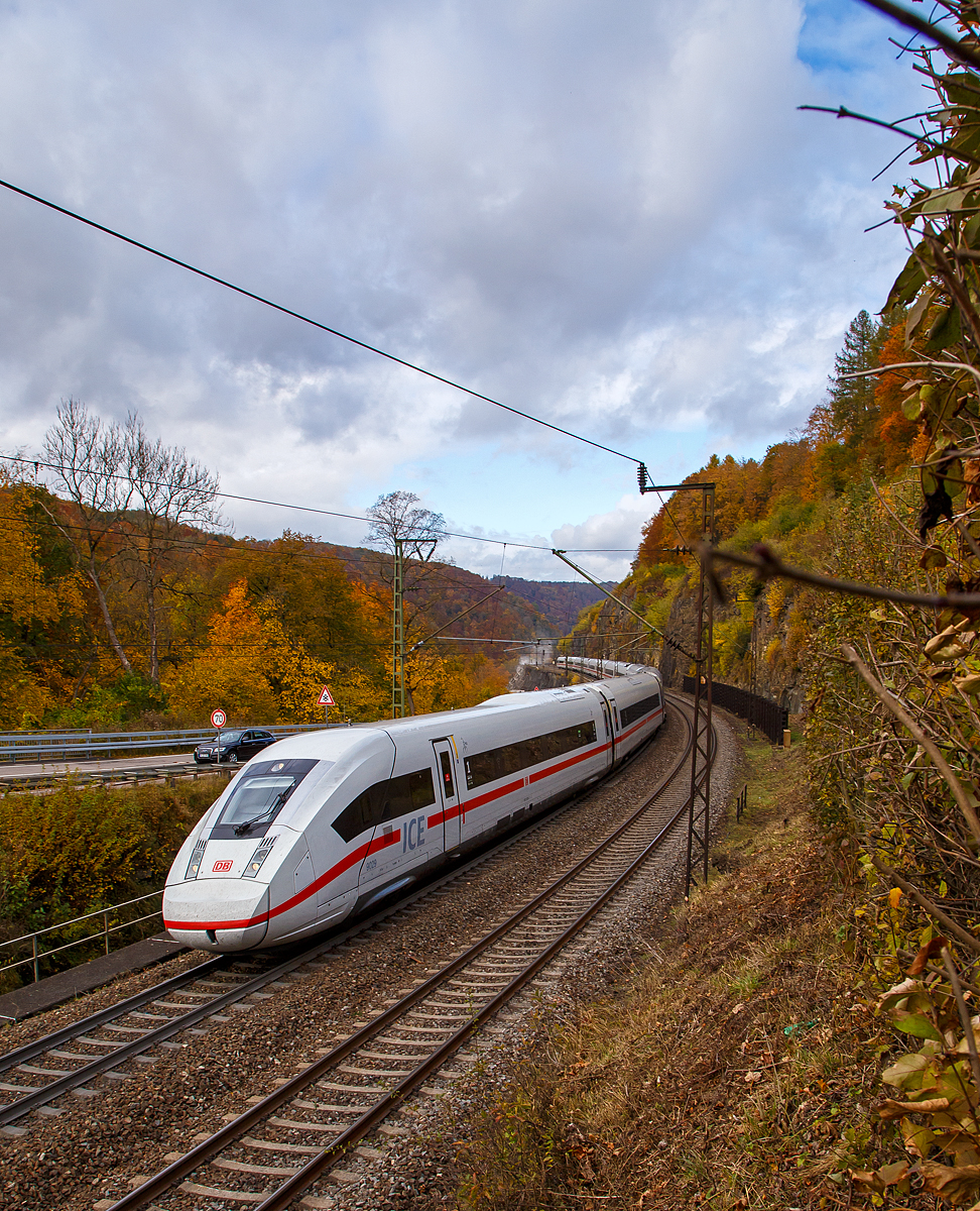 Der zwölfteilige ICE 4 – Tz 9038 (Triebzug) fährt am 26.10.2021 durch den Bahnhof Amstetten (Württ) in Richtung Ulm.