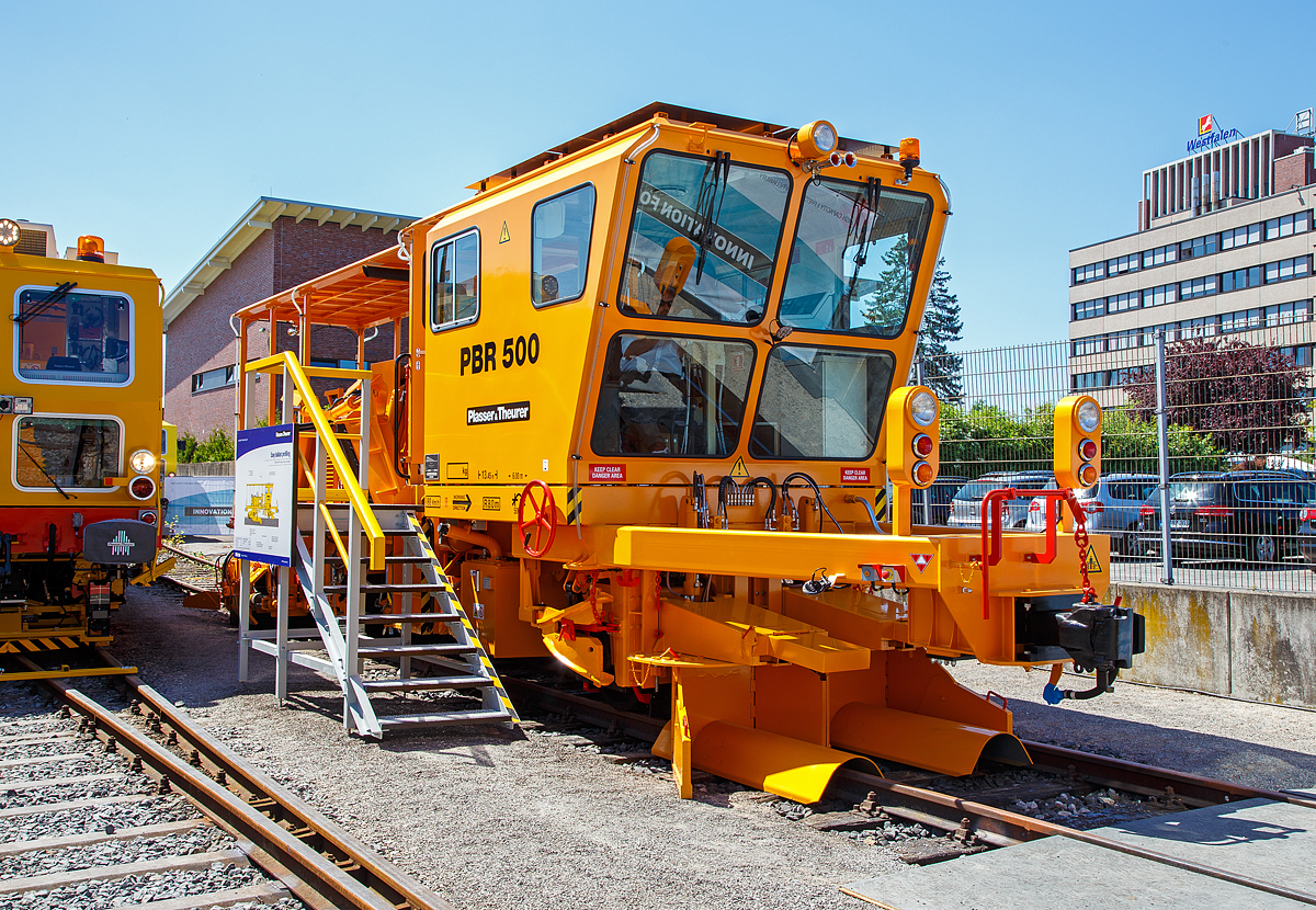 Technische-Schautafel zu der Plasser & Theurer PBR 500 Schmalspur Schotterverteil- und Planiermaschine, für die KTM Berhad (Malaysia), präsentiert auf der Internationale Ausstellung Fahrwegtechnik iaf 2017 in Münster hier am 01.06.2017.