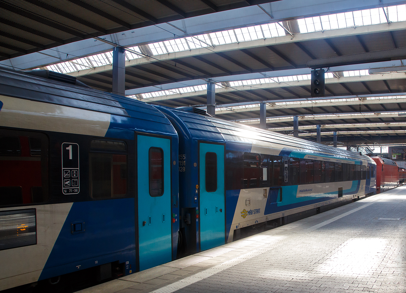 Der ungarische 1te Klasse Reisezugwagen (Abteilwagen) H-START 61 55 19-91 108-0 der Gattung Amz der MÁV-START Zrt. (Ungarische Staatsbahnen, Personenverkehrssparte) am 25 Juli 2022 im Hbf München eingereiht im Zugverband des EN 462 „Kálmán Imre“ (Budapest - Győr - Hegyeshalom – Wien - Linz – Salzburg - München) / EN 498 „Lisinski“ (Zargreb – Dobova – Ljubjana – Jesenice – Villach – Salzburg – München).