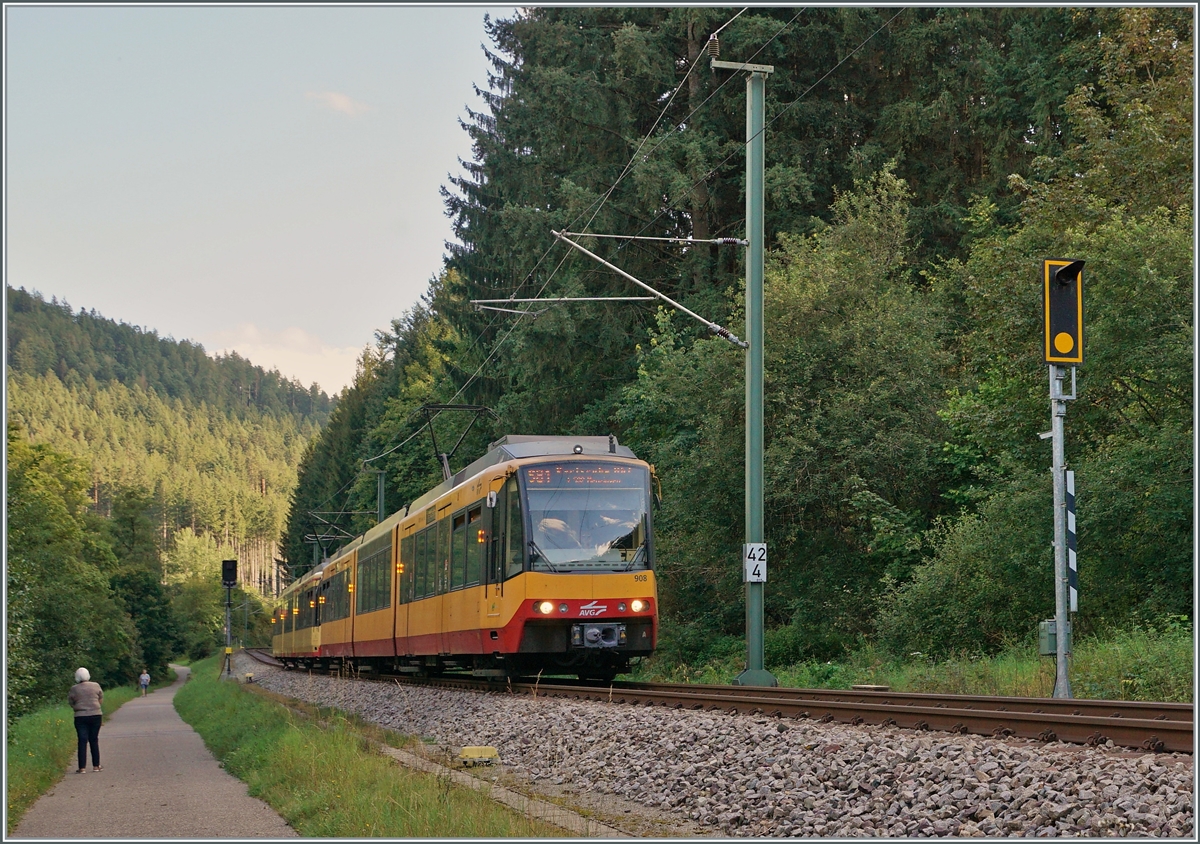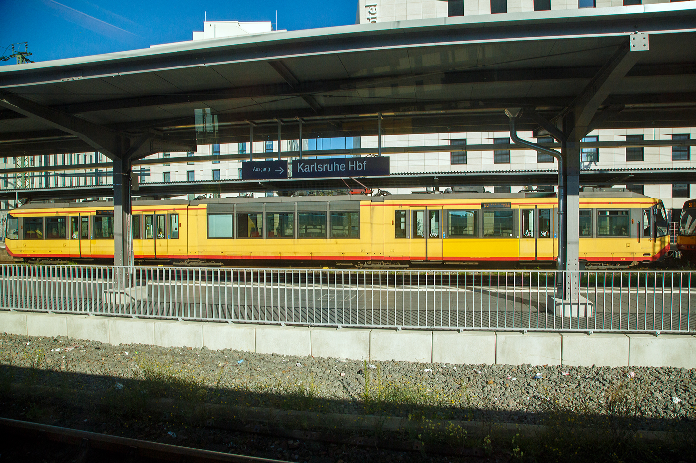 Der Stadtbahntriebwagen AVG 578, ex AVG 538, ein DUEWAG GT8-80C, verlässt am 16.12.2017, als S 1von Bad Herrenalb nach Hochstetten, die Station Karlsruhe Hbf (Vorplatz).