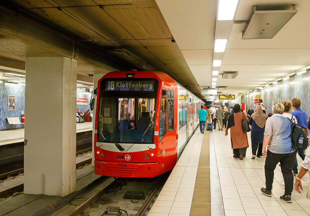 Zwei gekuppelte zweiteilige Hochflur-Stadtbahnwagen (vorne TW 2323 und ein weiterer) vom Typ DUEWAG B 80 D, der KVB (Kölner Verkehrs-Betriebe AG) fahren am 01.06.2019 als Linie 18 Barbarossaplatz (Köln) weiter in Richtung Bonn Hbf.