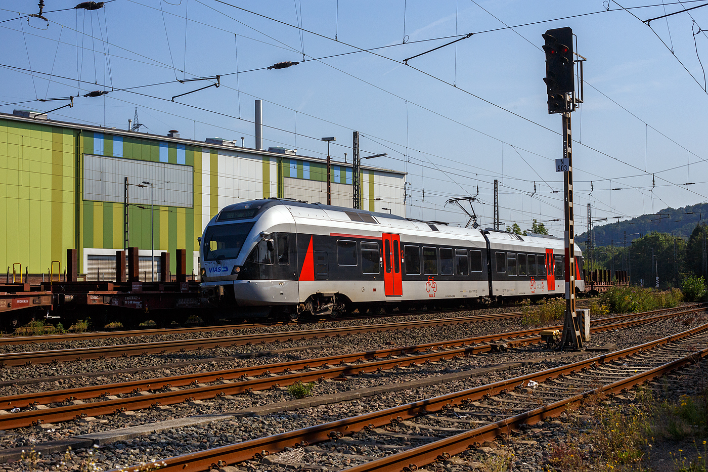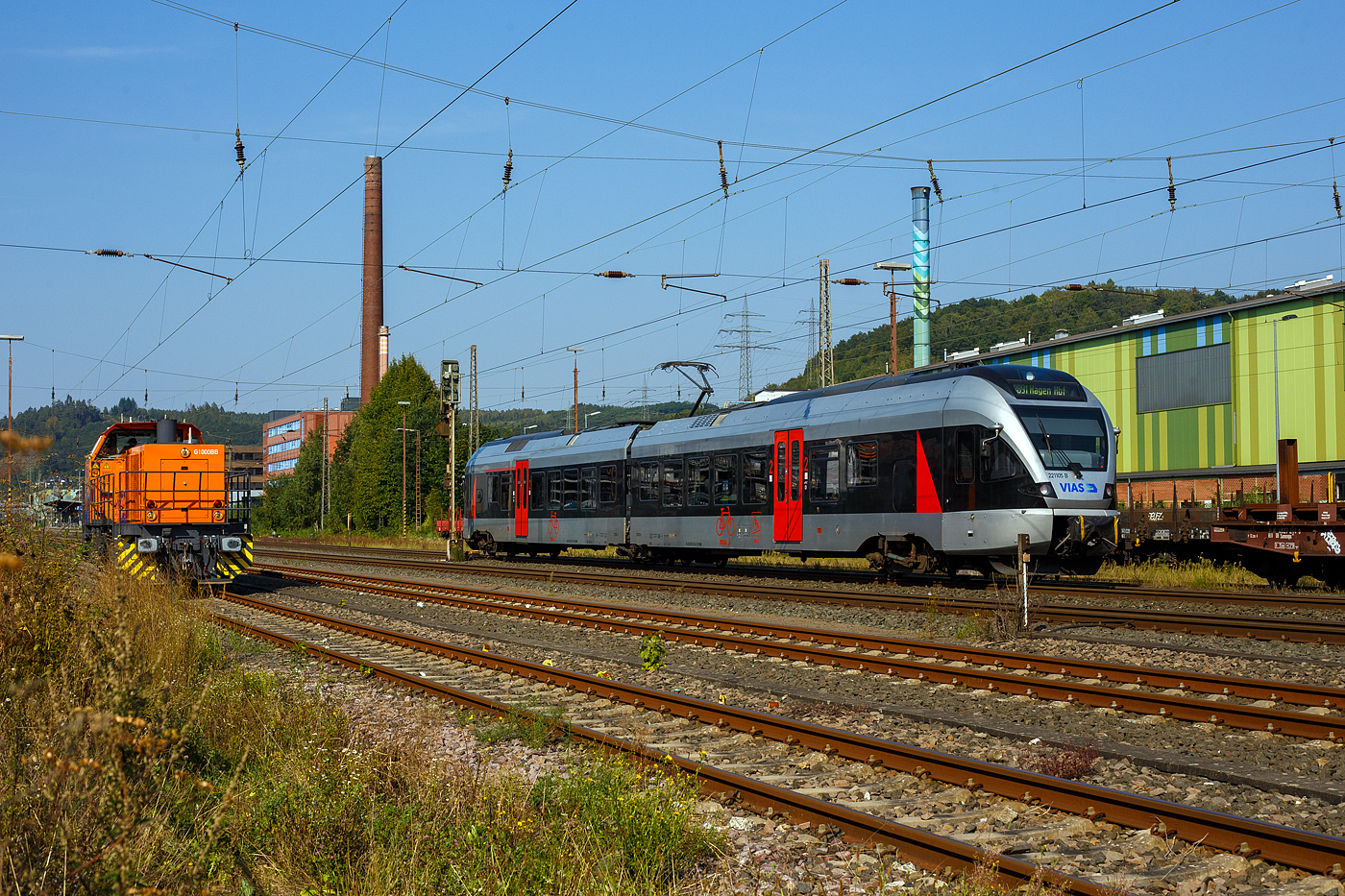 Der ET 22 2104 (94 80 0426 103-8 D-ABRN / 94 80 0826 103-4 D-ABRN), ex ET 22 004, ein 2-teiliger Stadler Flirt der Abellio Rail NRW erreicht am 20.04.2018, als RB 91 "Ruhr-Sieg-Bahn" (Hagen - Siegen), den Bahnhof Kreuztal.