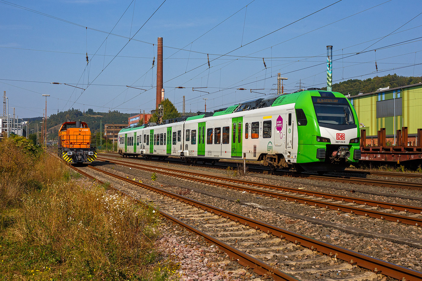 Die DEW 7 (Lok 7 der Deutschen Edelstahlwerke GmbH), zuvor Edelstahlwerke Südwestfalen, rangiert am 05 September 2023 mit vierachsigen Drehgestellflachwagen am Haken, vom Anschlussgleis zurück aufs Werksgelände in Siegen-Geisweid.