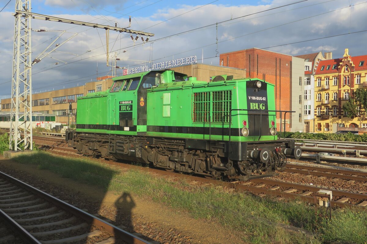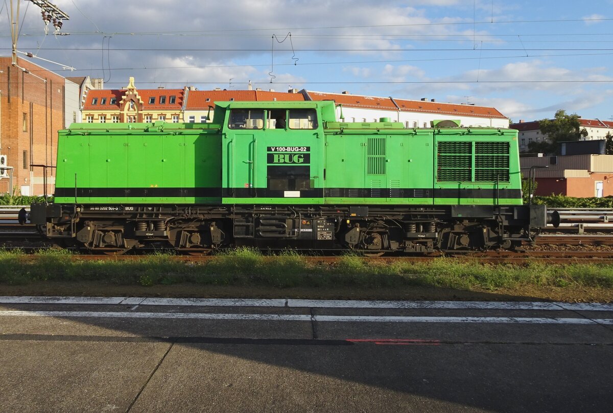 Mit verkehrtherum geschalteten Lichtern, fährt die V 100-BUG-04 (92 80 1202 240-8 D-BUG), ex DB 202 240-8, ex DR 112 204-7, ex DR 110 240-9, am 27.10.2018 als Lz durch Siegen-Eiserfeld in Richtung Siegen.