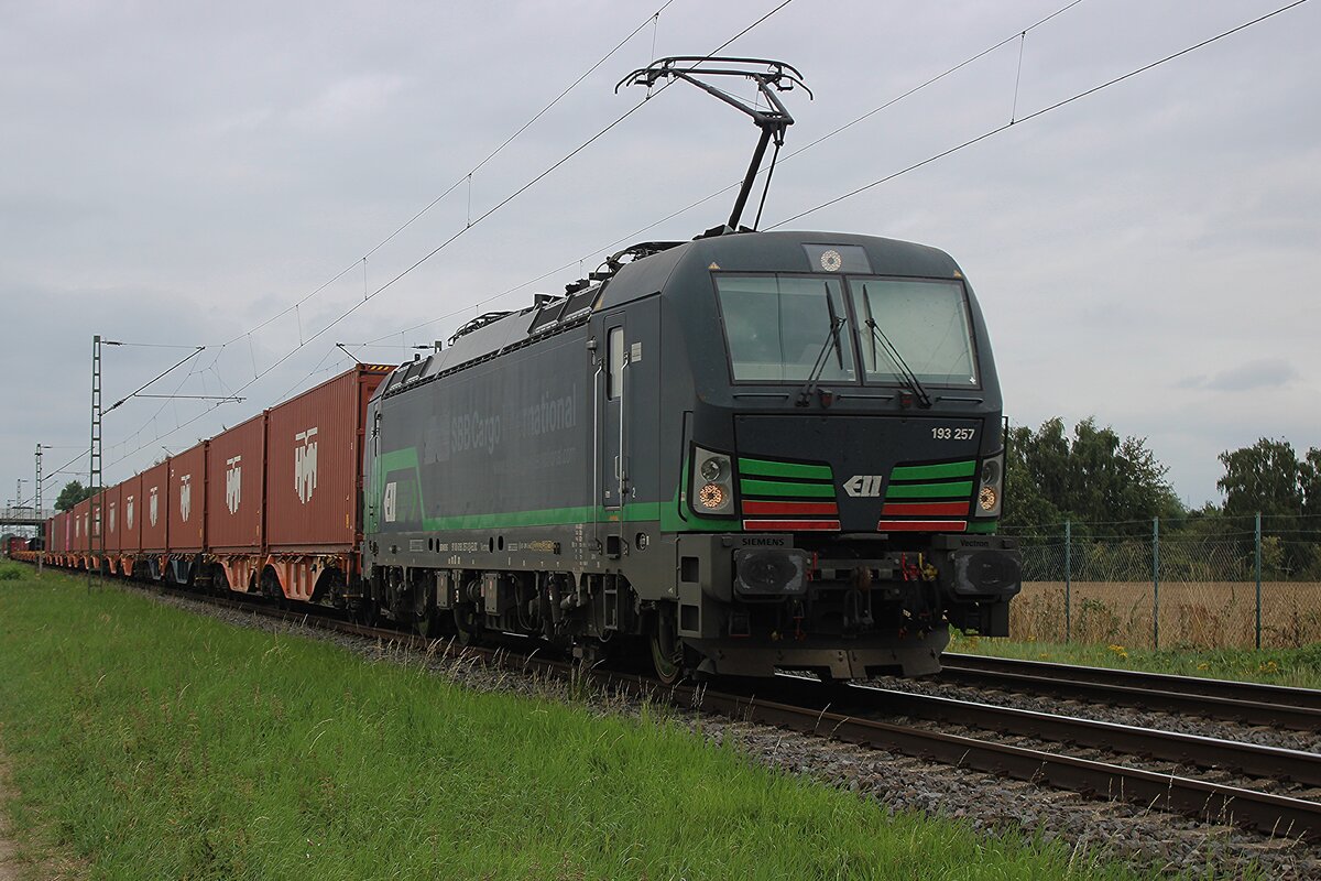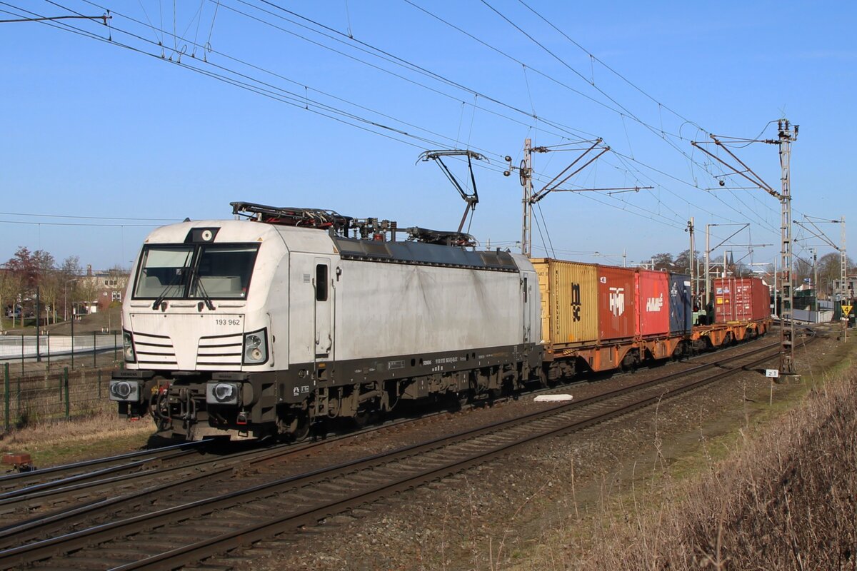 Die an die LTE Logistik- und Transport GmbH vermietete Vectron MS 193 739 (91 80 6193 739-0 D-ELOC) der European Locomotive Leasing, fährt am 22.03.2022 mit einem Containerzug durch Scheuerfeld (Sieg) in Richtung Siegen.