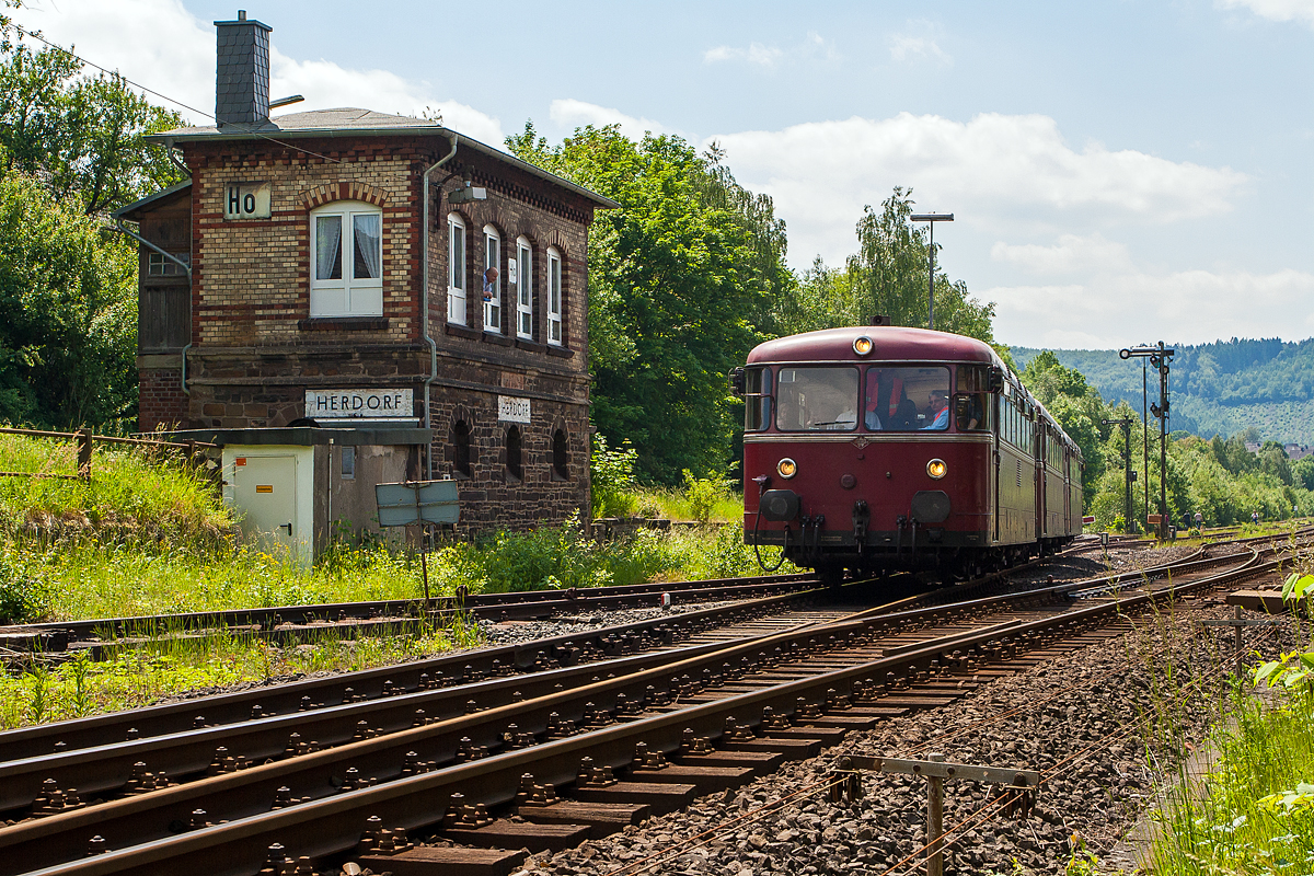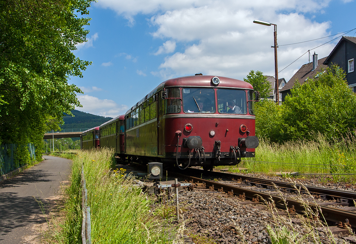 So erreicht hier Stilecht die Schienenbusgarnitur des FSB - Förderverein Schienenbus e.V. (Menden), bestehend aus Schienenbus 796 690-6, Beiwagen 996 309-1 und Schienenbus 796 802-7, bald den Bahnhof Herdorf.