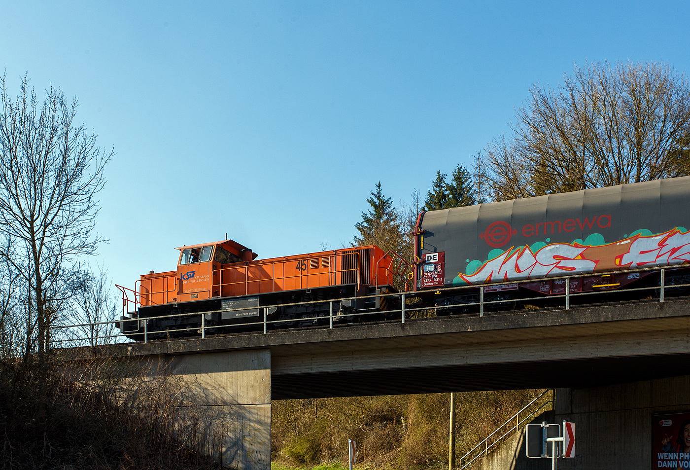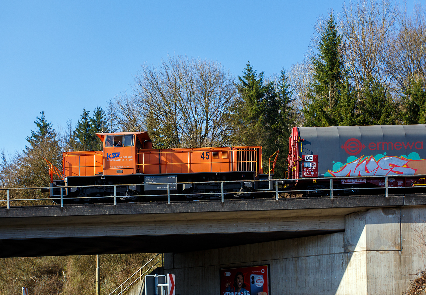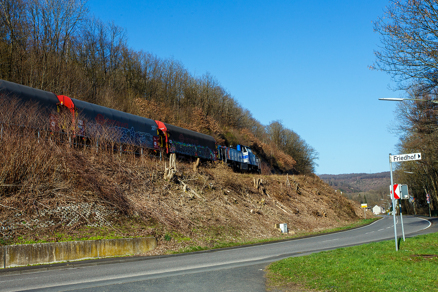 Der VT 252 (95 80 0648 152-6 D-HEB / 95 80 0648 652-5 D-HEB), ein Alstom Coradia LINT 41 der HLB (Hessische Landesbahn), ex Vectus VT 252, erreicht als RB 96 „Hellertalbahn“ von Betzdorf/Sieg nach Neunkirchen (Kr Siegen), am 19 März 2026 den Bahnhof Herdorf. Hinten auf Gleis 4 im Bahnhof wartet bereits die KSW 45 (98 80 0276 016-9 D-KSW), die MaK G 1204 BB der Kreisbahn Siegen-Wittgenstein, mit einem Übergabezug.