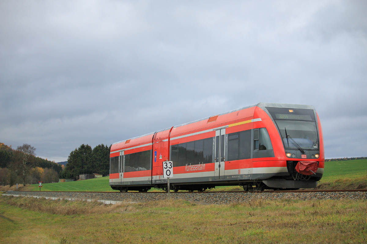 Der Desiro 642 061 / 642 561 (95 80 0642 061-5 D-DB / 95 80 0642 561-4 D-DB) erreicht am 24.03.2018, als RB 94 (Erndtebrück – Bad Laasphe – Marburg) den Bf Biedenkopf.