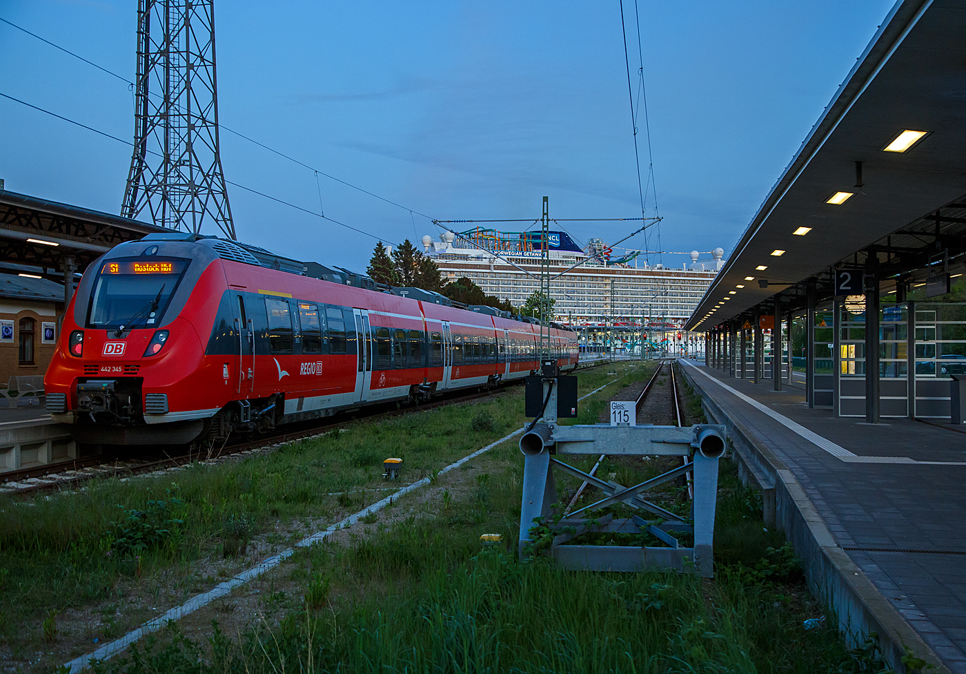 Da braucht es schon einige Züge, wenn man die ganzen Passagiere in Züge packen will. Der Bahnhof Warnemünde am 15 Mai 2022, hinten im Warnemünde Cruise Center liegt am Warnemünde Passagierkai, Pier 8, das gewaltige Kreuzfahrtschiff NORWEGIAN GETAWAY der US-amerikanischen Reederei Norwegian Cruise Line Corporation Ltd. (NCL). Da sieht der dreiteilige Bombardier Talent 2 (BR 442/443) der S-Bahn Rostock, der gerade kommt, wie ein größeres Rettungsboot des Schiffes aus.
