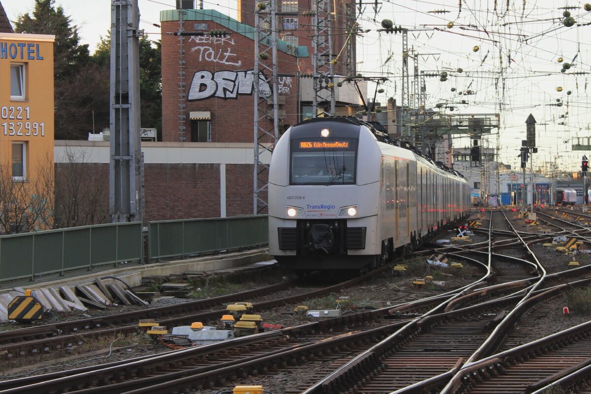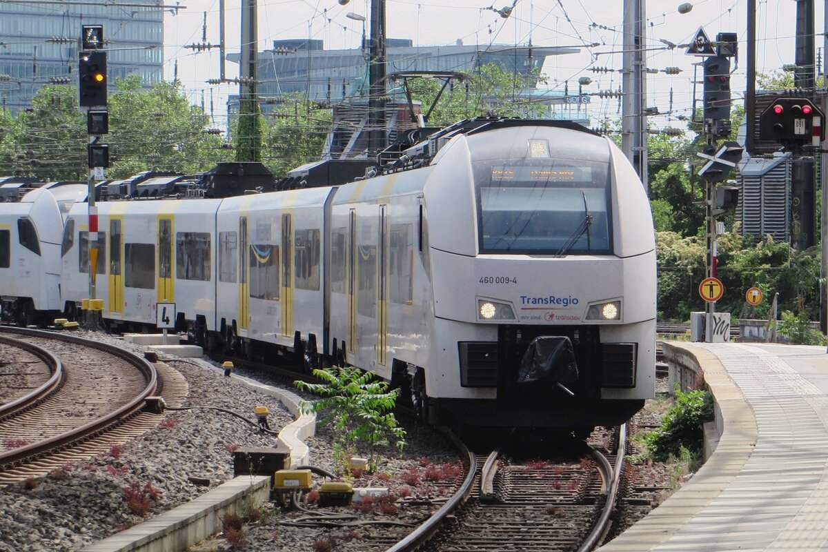 Ein Bild für Stefan mit gleich drei „Borkenkäfer“, geführt von dem 460 017-7 / 860 017 / 460 517 fahren drei gekuppelte Siemens Desiro ML Triebzüge der TDR - Trans Regio Deutsche Regionalbahn GmbH (zur Transdev-Gruppe gehörend) am frühen Morgen des 18 Juni 2025, als MRB 26 "MittelrheinBahn" (Köln Messe/Deutz – Köln Hbf - Koblenz Hbf - Mainz Hbf), in den Hauptbahnhof Köln ein.