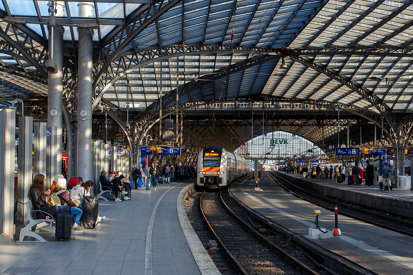Der Siemens Desiro HC 462 022 des Rhein-Ruhr-Express fährt am 21.04.2019 (Ostersonntag), wohl auf Leerfahrt mit Anzeige „Frohe Ostern“ durch den Bahnhof Köln Süd.