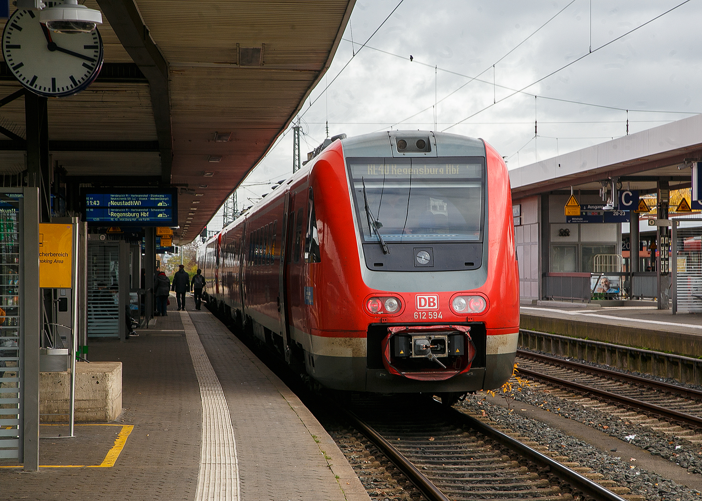 Der Dieseltriebwagen mit Neigetechnik 612 481 / 612 981, ein Bombardier "RegioSwinger" der DB Regio Bayern, verlässt am 24.11.2022, als RE 40 nach Nürnberg Hbf, den Hauptbahnhof Regensburg.