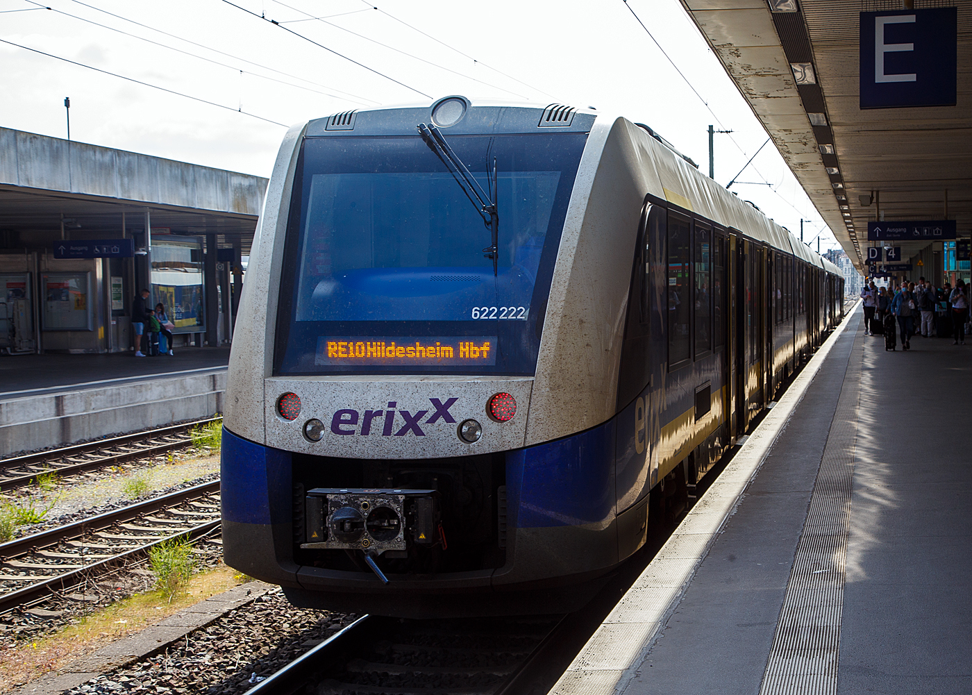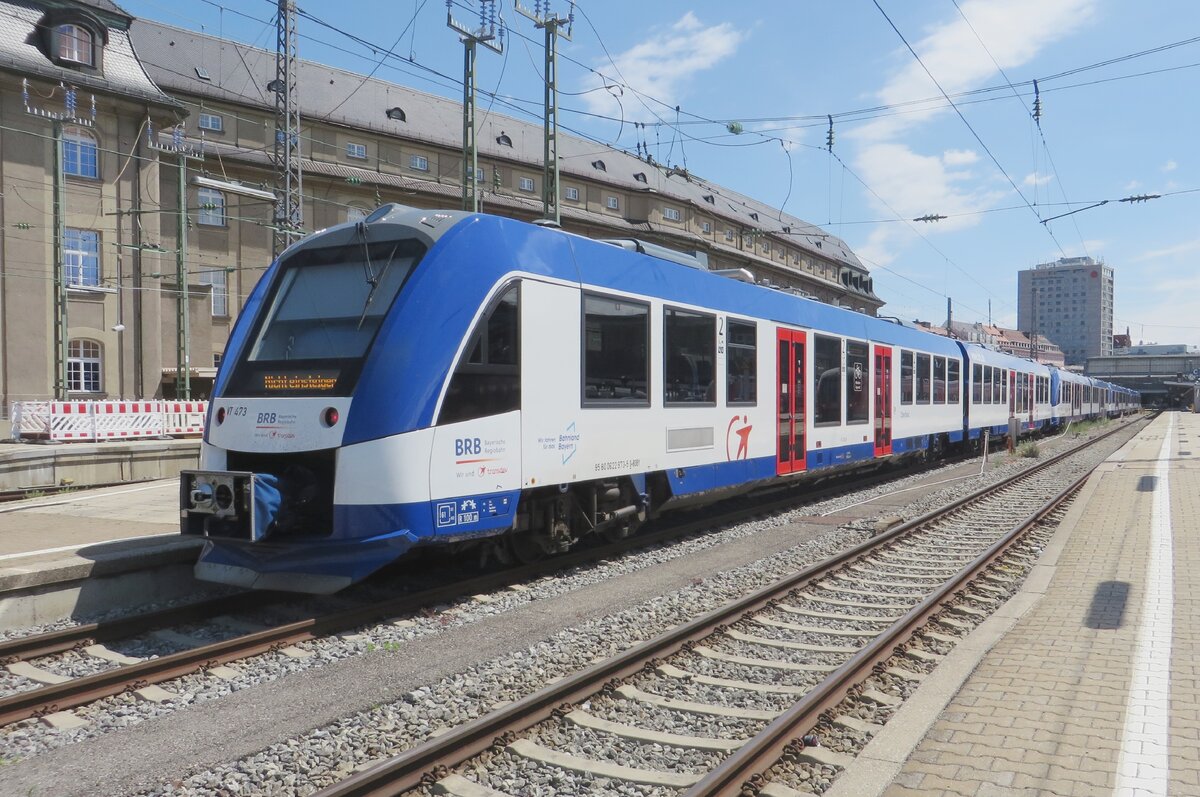 Ein zweiteiliger Dieseltriebzug vom Typ ALSTOM Coradia LINT 54 (BR 622) der DB Regio Mitte am 07.09.2023 bei Hofheim (Ried). Bild aus einem ICE heraus.