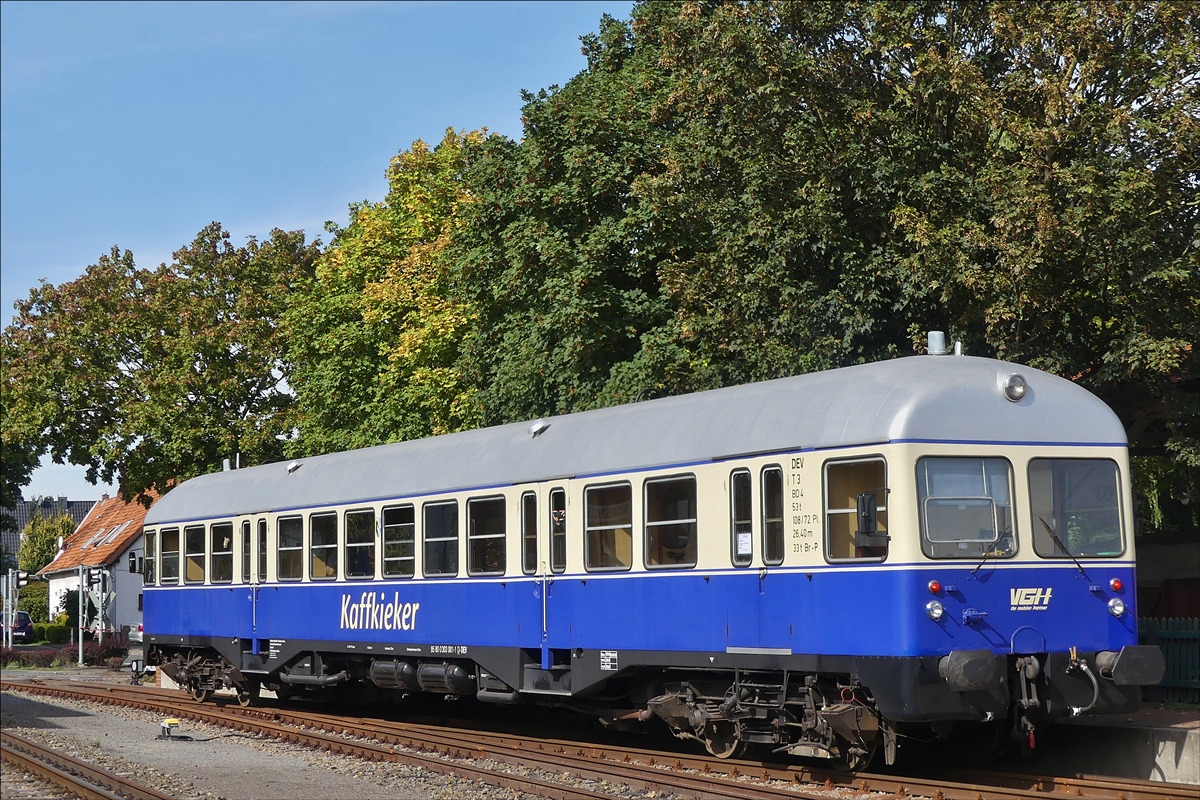 DEV T3 Dieseltriebzug (95 80 0303 001-1 D –DEV)genannt „Kaffkieker“ der Hoyaer Eisenbahn ist im Musemsbahnhof von Bruchhausen – Vilsen angekommen. Dieser fährt an einigen Sonntagen im Monat ab dem 1. Mai bis zum 03.10.2019 die Strecke zwischen Eystrup über Hoya nach Syke. 			                           Fahrzeugdaten: Gebaut 1959 von der Maschienenbau AG in Kiel (MaK), Fabriknr 513, Spurweite 1435mm, Bauart: (1A)'(A1)'-dh. Angetrieben wird er von 2 Motoren mit je 220 PS. Nach verschiedenen Einsatzgebieten ist er seit dem 1. Mai 2007 auf dieser Strecke im Einsatz.					     				     Mehr Infos unter: http://www.museumseisenbahn.de/index.php/de/hoyaer-eisenbahn/21-kaffkieker.html  15.09.2019 (Jeanny)