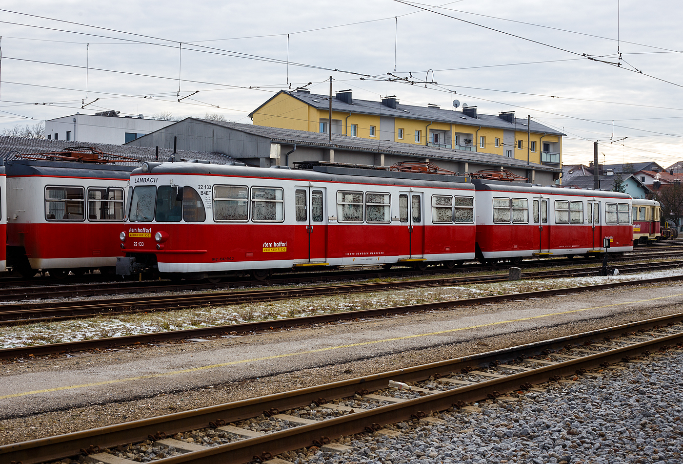 Von der Steuerwagenseite (ES 22.233), der vierachsige Elektrotriebwagen ET 22.133 (B4 ET 9481 4942 000-0) ex KFBE 1288, ex KVB 1003, ist gekuppelt mit dem vierachsigen Steuerwagen ES 22.233, ex KFBE 2289, ex KVB 2003, ex KVB 1503, beide der Stern & Hafferl Verkehrsgesellschaft m.b.H. (StH), sind am 04 April 2025 beim Bahnhof Vorchdorf-Eggenberg abgestellt.