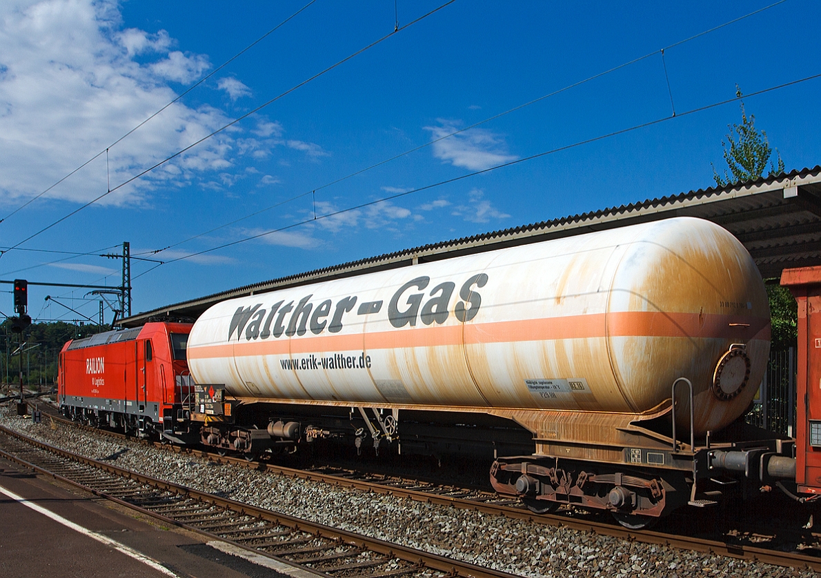 Vierachsiger Drehgestell 95 m³ Druckgas-Kesselwagen ohne Sonnenschutzdach, 33 80 7918 308-7 D-ARETZ, der Gattung Zagkks, der ARETZ GmbH & Co. Kesselwagen KG (Krefeld), laut Anschrift und Gefahrgut-Warntafel (23/1965) beladen mit Kohlenwasserstoffgas, Gemisch, verflüssigt, n.a.g. (Gemisch C) am 17 Juli 2025 im Zugverband bei einer Zugdurchfahrt in Kirchen (Sieg) in Richtung Köln.