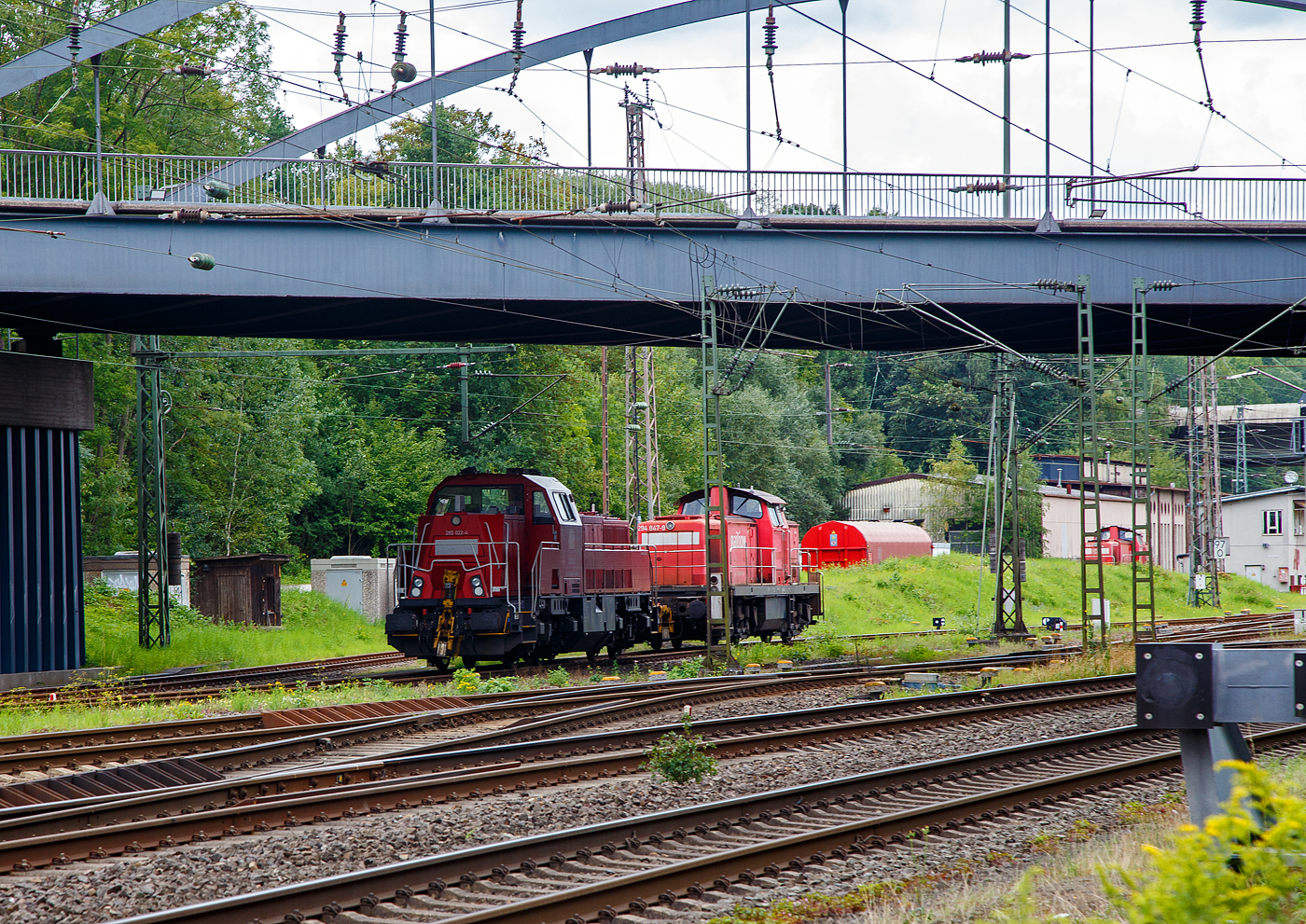 Die Kreuztaler 265 031-5 (92 80 1265 031-5 D-DB), eine Voith Gravita 15L BB der DB Cargo AG, fährt am 04.05.2023 mit einem Coilzug (Wagen der Gattung Shimmns) durch den Bahnhof Kirchen (Sieg) in Richtung Siegen bzw. Kreuztal.