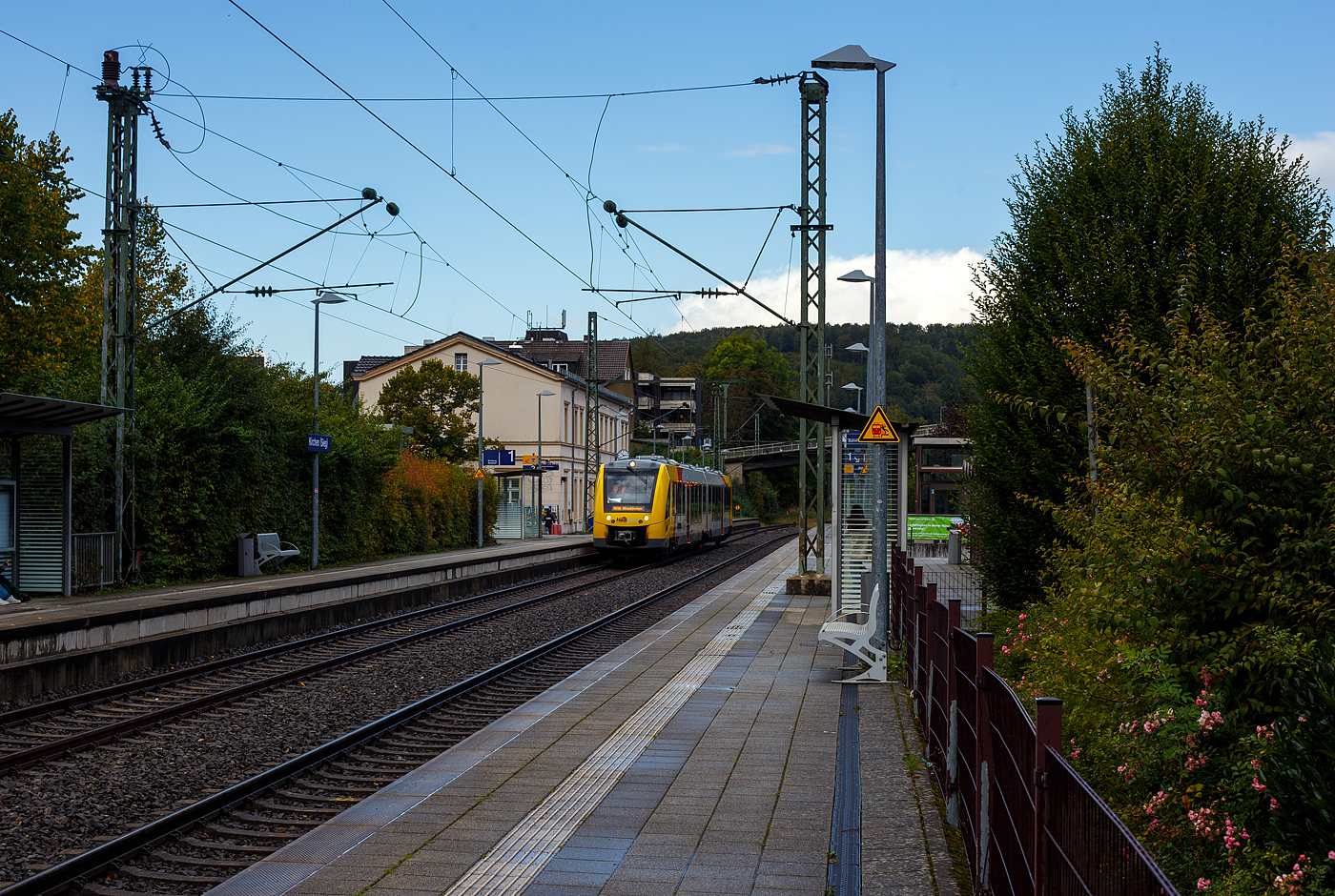 Der Verbrennungstriebwagen VT 507 (95 80 1648 107-8 D-HEB / 95 80 1648 607-7 D-HEB), ein Alstom Coradia LINT 41 der neuen Generation, der HLB (Hessische Landesbahn GmbH) verlässt am 28 September 2024, als RB 90 "Westerwald-Sieg-Bahn“ (Siegen – Betzdorf – Au/Sieg – Altenkirchen/Ww), den Bahnhof Kirchen/Sieg, nächster Halt Betzdorf/Sieg.