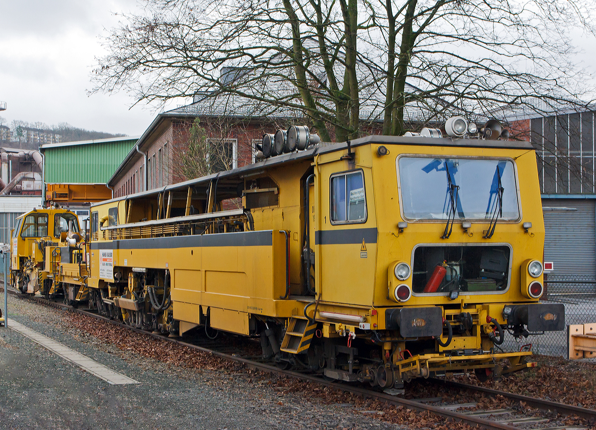 Die Plasser & Theurer Zweischwellenstopfmaschine 09 - 32 CSM (Schweres Nebenfahrzeug Nr. 97 40 68 524 17 -9) und die Matisa Schotterplaniermaschine vom Tpy R 20 L (Schweres Nebenfahrzeug Nr. 97 16 38 501 17 – 3) beide von der Firma Hans Kaiser GmbH & Co. KG aus Tann stehen am 20.12.2014 auf dem Verbindungsgleis zwischen dem Hbf Siegen und dem KSW Bahnhof Siegen-Eintracht.