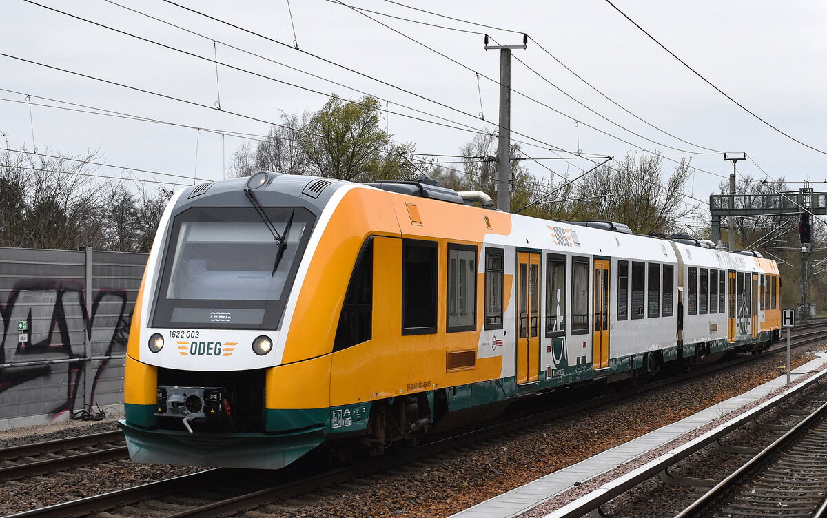 Ostdeutsche Eisenbahn GmbH, Parchim (ODEG) mit ihrem Desiro HC "3462 610-1" (NVR: "94 80 3462 610-1 D-ODEG.....") als RE1 nach Eisenhüttenstadt am 08.04.26 Durchfahrt Bahnhof Wiesenau.
