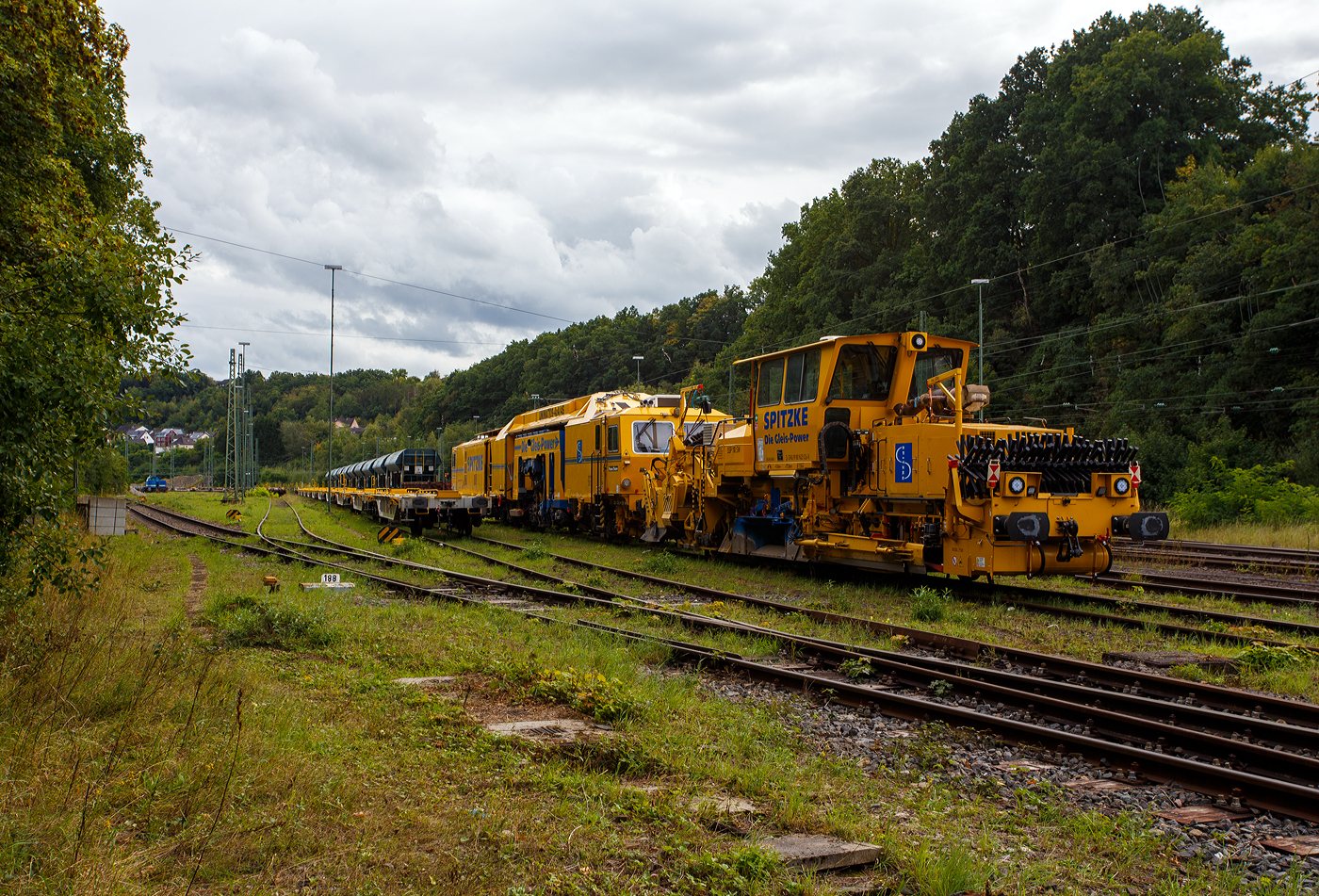 Ein LIEBHERR Zweiwegebagger A 922 Rail Litronic der SPITZKE SE (Großbeeren) mit angebautem Schwellenverlegegerät Typ 159-5 greift sich die nächsten 5 Schwellen von einem Res-Güterwagen und verlegt diese im neuen Gleisbett im Rbf Betzdorf/Sieg am 08. November 2025. Hier werden zurzeit Gleise erneuert.