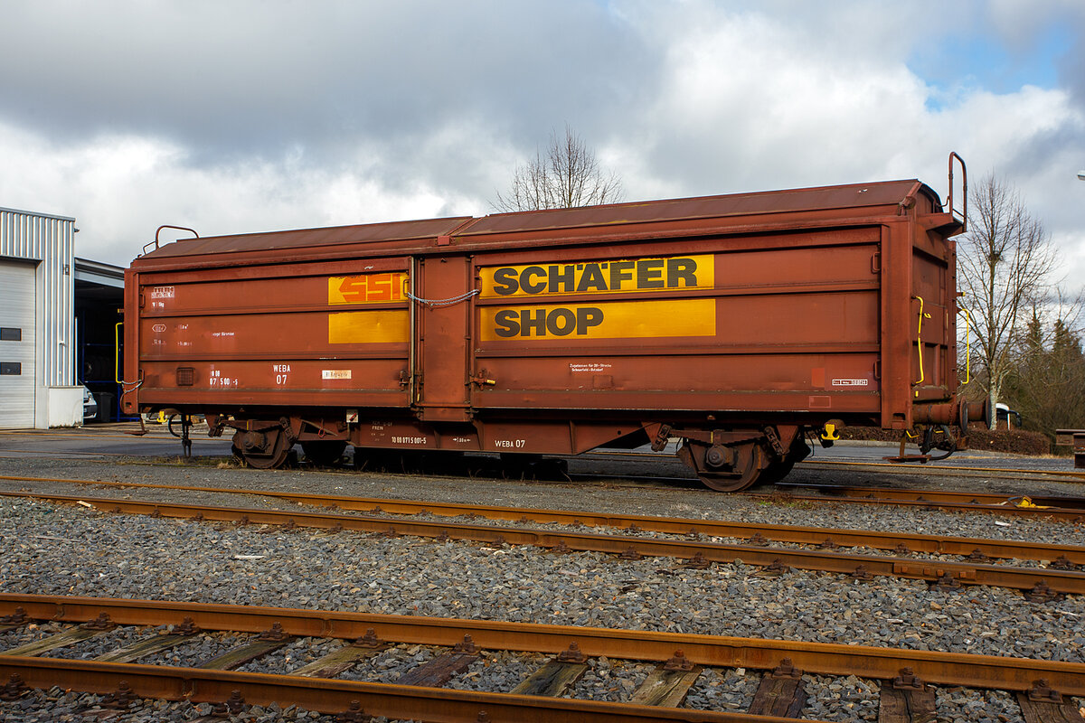 Der gedeckte zweiachsige Schiebewand-/Schiebedachwagen WEBA 06 - 10 80 0715 000-7 D-WEBA (ex 10 80 0715 000-7 D-DB) der Gattung Tbis 869 - Bauform A (für Büromöbel der SSI Schaefer Shop GmbH) ehemals der WEBA (Westerwaldbahn des Kreises Altenkirchen GmbH), ausgestellt am 07 Juli 2024 beim Erlebnisbahnhof Westerwald der Westerwälder Eisenbahnfreunde 44 508 e. V. in Westerburg, hier war Lokschuppenfest.