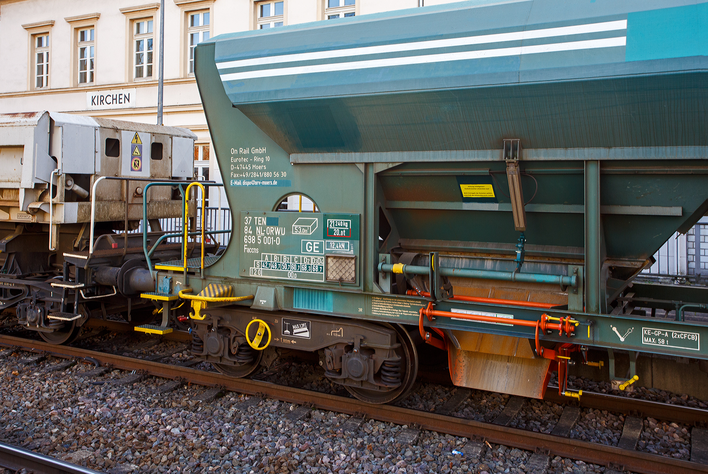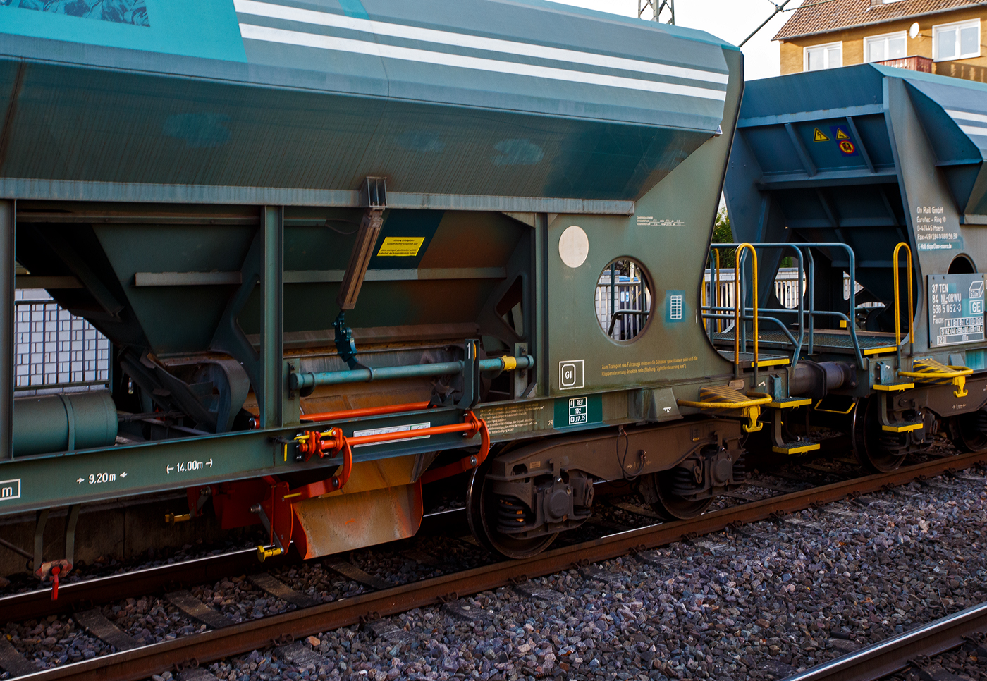 4-achsigiger offener Drehgestell-Schüttgutwagen mit dosierbarer Schwerkraftentladung der On Rail Gesellschaft für Eisenbahnausrüstung und Zubehör mbH, 37 80 6992 049-4,der Gattung Faccs-zz, am 24.08.2019 im Zugverband bei Anzhausen auf der Dillstrecke.