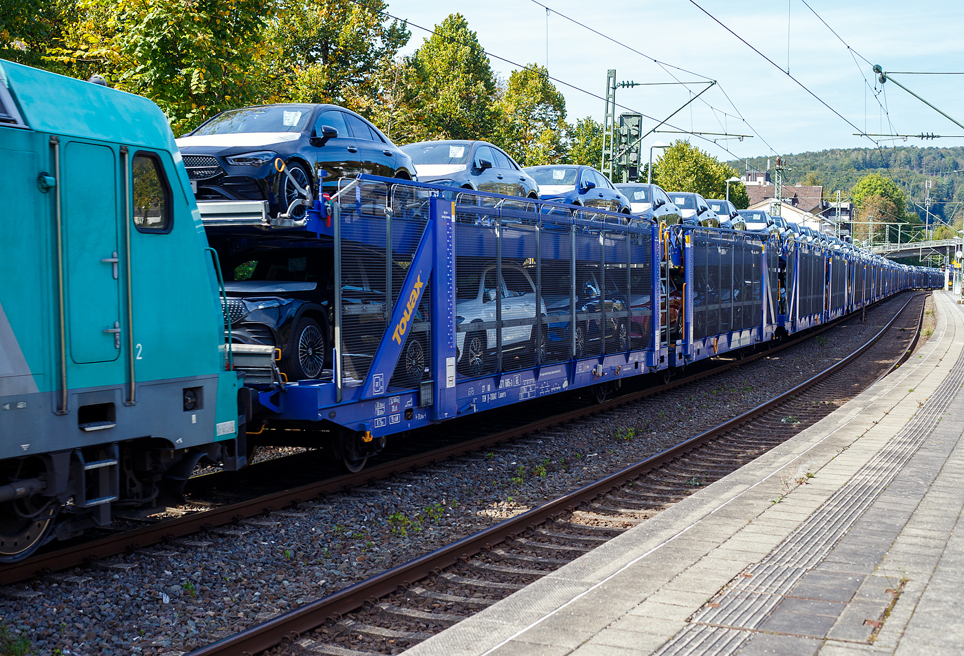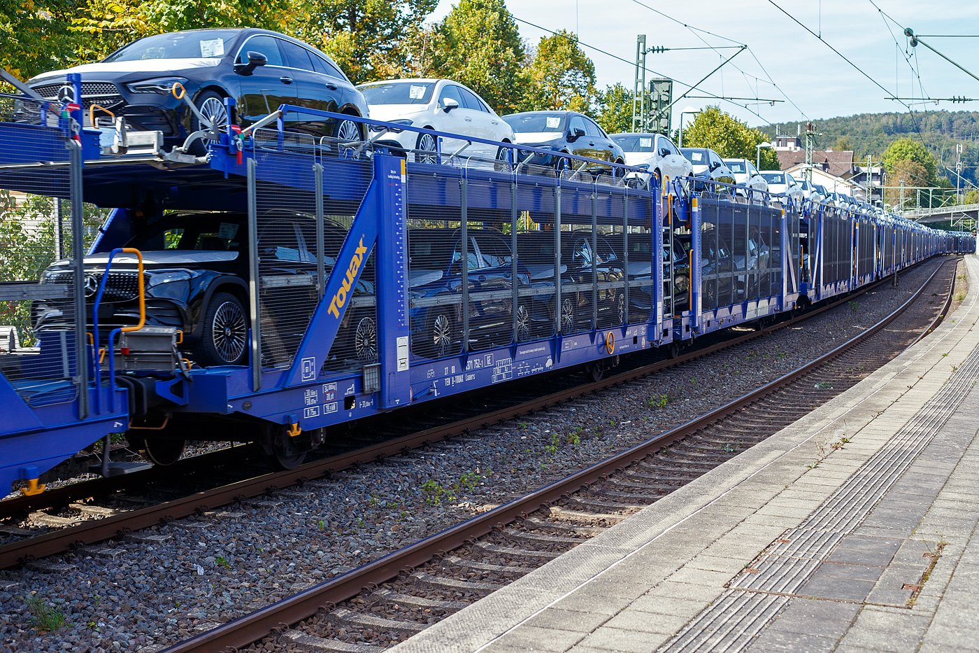 2 x 2 achsiger leerer offener Doppelstock-Autotransportwagen (Wageneinheit) 27 80 4371 793-3 D-TOUAX, der Gattung Laaers, der irländischen Vermietungsfirma TOUAX Rail Limited, am 24.03.2023 im Zugverband bei einer Zugdurchfahrt in Niederschelde (Sieg).
