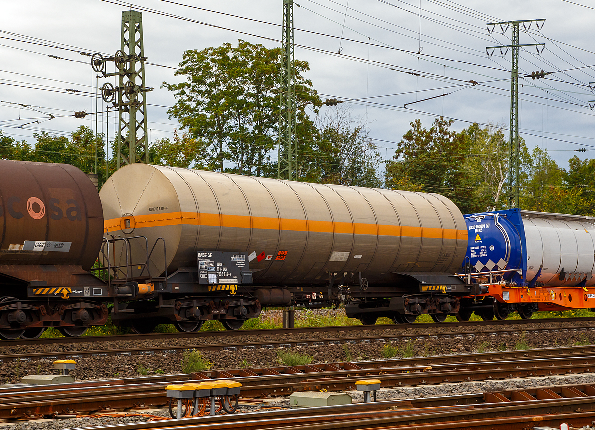 Der vierachsige 66m³-Drehgestell-Kesselwagen (Chemiekesselwagen mit Isolierung und Heizung). 33 80 7932 761-9 D-BASF der Gattung Zacens der BASF SE Ludwigshafen (Rhein) am 22 Mai 2024 im Zugverband bei der Zugdurchfahrt in Rudersdorf (Kreis Siegen). Das Ladegut ist wohl kein Gefahrgut.
