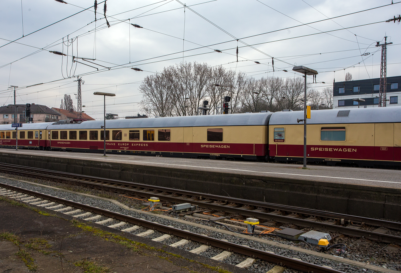 Der TEE-Speisewagen D-AKE 56 80 88-95 001-5 der Gattung WRmz 135.0, der AKE-Eisenbahntouristik – Jörg Petry e.K. (Gerolstein) am 10 März 2024 im Hbf Osnabrück, eingereiht im Zugverband in den 1. Klasse-Sonderzug AKE RHEINGOLD (vom 10 bis 14 März 2024) von Koblenz via Hamburg, Bremen, Husum und Westerland auf Sylt nach List auf Sylt.