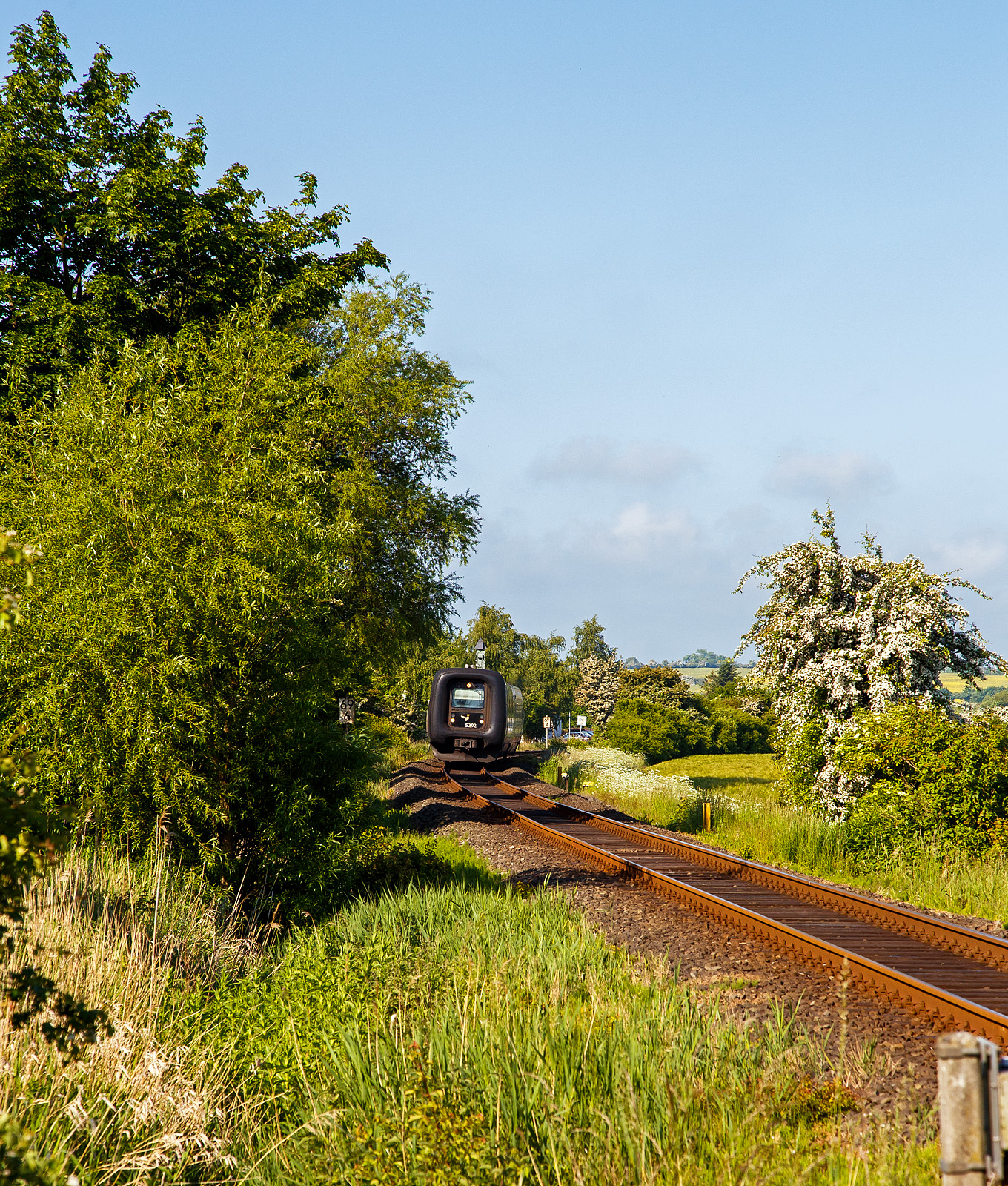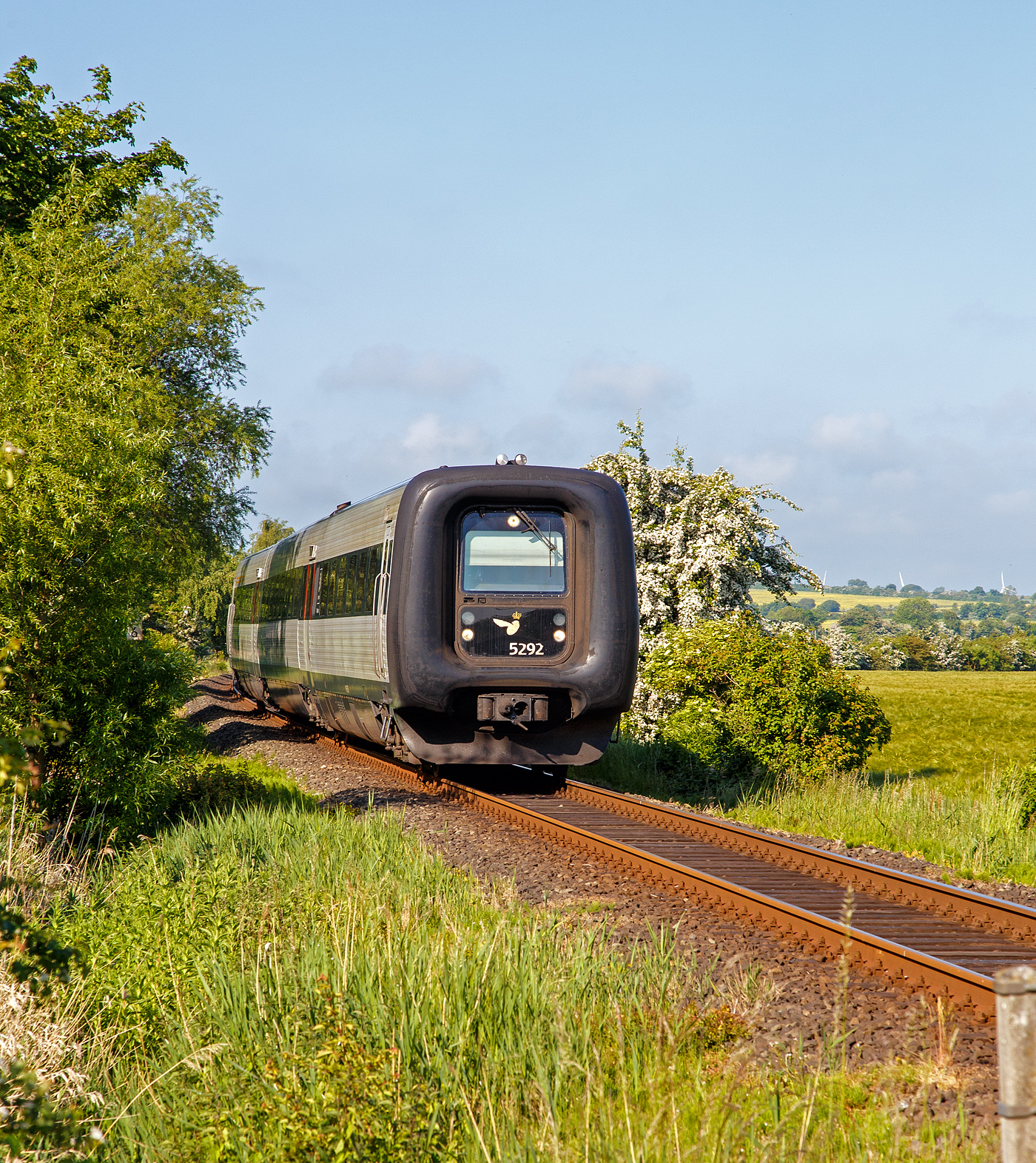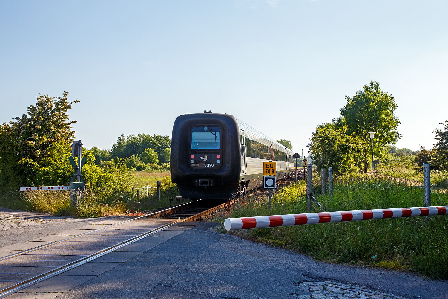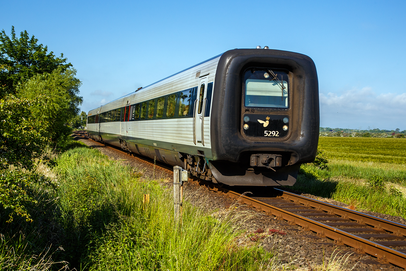 Die DSB Gumminase bzw. der DSB IC 3 – MFB 5292 / FF 5492 / MFA 5092 (DSB-Baureihe MF) fährt am 12 Juni 2015 als EC 31 (Hamburg - Lübeck - Puttgarten - Rödby - Kopenhagen), hier auf der „Vogelfluglinie“ beim Bü 69,8 der Bahnstrecke Lübeck–Puttgarten (KBS 141) bei Großenbrode. Die Bahnstrecke Lübeck–Puttgarden (auch „Bäderbahn“) ist eine Hauptbahn in Schleswig-Holstein. Sie führt von Lübeck entlang der Lübecker Bucht und über die Halbinsel Wagrien auf die Ostsee­insel Fehmarn. Bis zur Einstellung der Eisenbahnfährverbindung Puttgarden–Rødby 2019 wurde die Strecke als Teil der Vogelfluglinie von internationalen Fernzügen zwischen Hamburg und Kopenhagen befahren. Nach der Inbetriebnahme der festen Eisenbahnverbindung über den Großen Belt zwischen den dänischen Inseln Fünen und Seeland im Jahr 1997 wurde bereits die Trajektierung von Güterzügen über den Fehmarnbelt – und damit der Güterzugverkehr auf der Vogelfluglinie – eingestellt. Der internationale Güterzugverkehr zwischen den Großräumen Hamburg und Kopenhagen wird seitdem über Flensburg und Fredericia geführt. Dies bedeutet einen Umweg von 160 Kilometern. Zum 14. Dezember 2019 wurde die Eisenbahnfährverbindung auf der Vogelfluglinie aufgrund von Gleisarbeiten auf dänischer Seite im Zuge des Baus des Fehmarnbelttunnels eingestellt, stattdessen fahren nun alle Fernverkehrszüge zwischen Hamburg und Kopenhagen über die Jütlandlinie, also über die Strecke Flensburg–Kolding–Odense und die Großer-Belt-Querung. Im Vorgriff auf die Bauarbeiten für die Hinterlandanbindung der Festen Fehmarnbeltquerung wurde ab dem 31. August 2022 der gesamte Zugbetrieb zwischen Neustadt (Holstein) und Puttgarden auf Busse umgestellt und die Strecke nördlich von Neustadt zum Baugleis der Baustelle für den Fehmarnbelt-Tunnel.