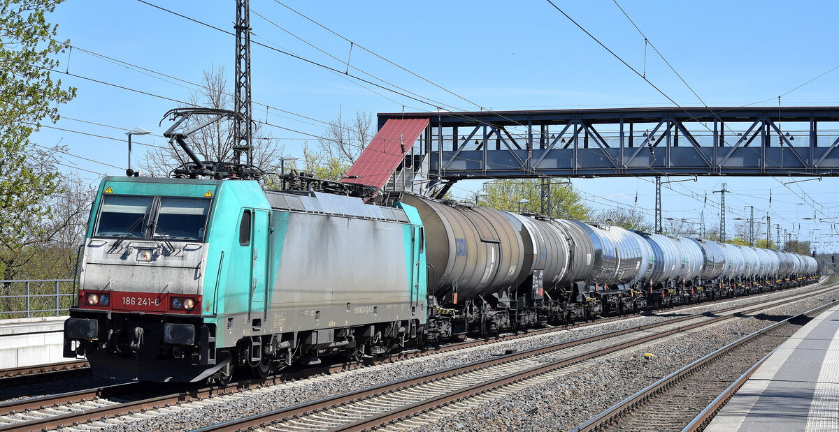 ČD Cargo a.s., Praha [CZ] mit der geleasten Akiem Lok"186 371-1" [NVR-Nummer: 91 80 6186 371-1 D-AKIEM] und einem PKW-Transportzug am 21.04.25 Höhe Bahnhof Rodleben.
