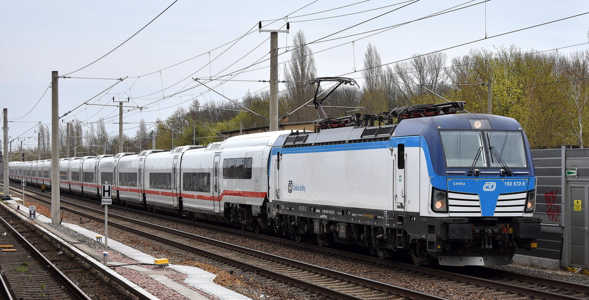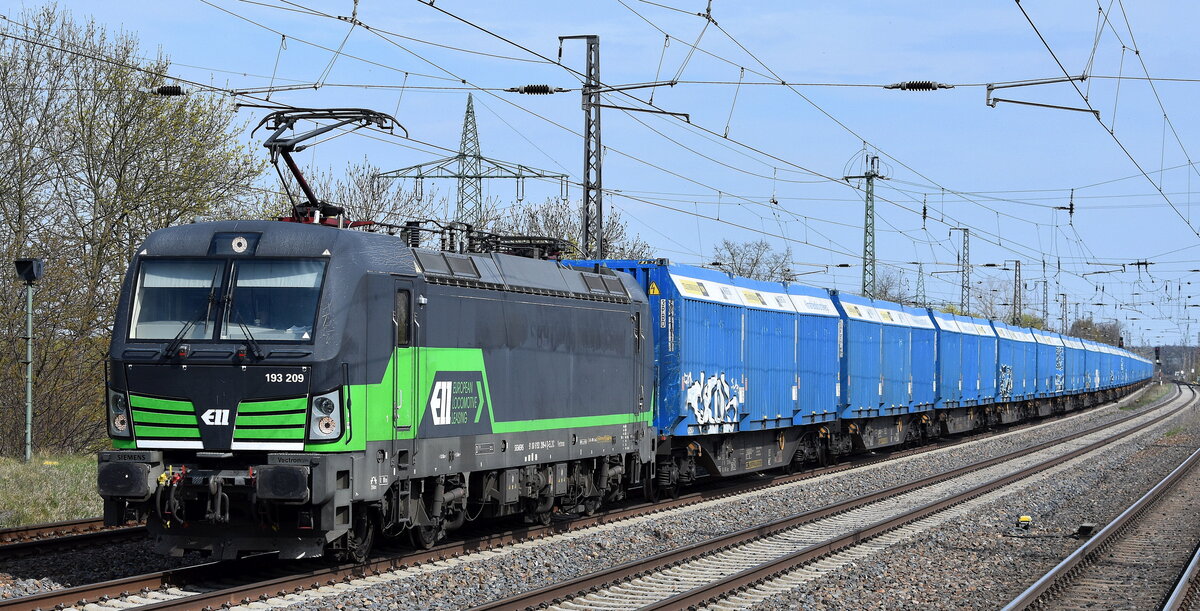 Green Cargo AB, Solna [S] mit der geleasten Akiem Vectron "193 869" [NVR-Nummer: 91 80 6193 869-5 D-AKIEM] und Containertragwagen (leer) am 14.05.25 Durchfahrt Bahnhof Hamburg-Harburg.
