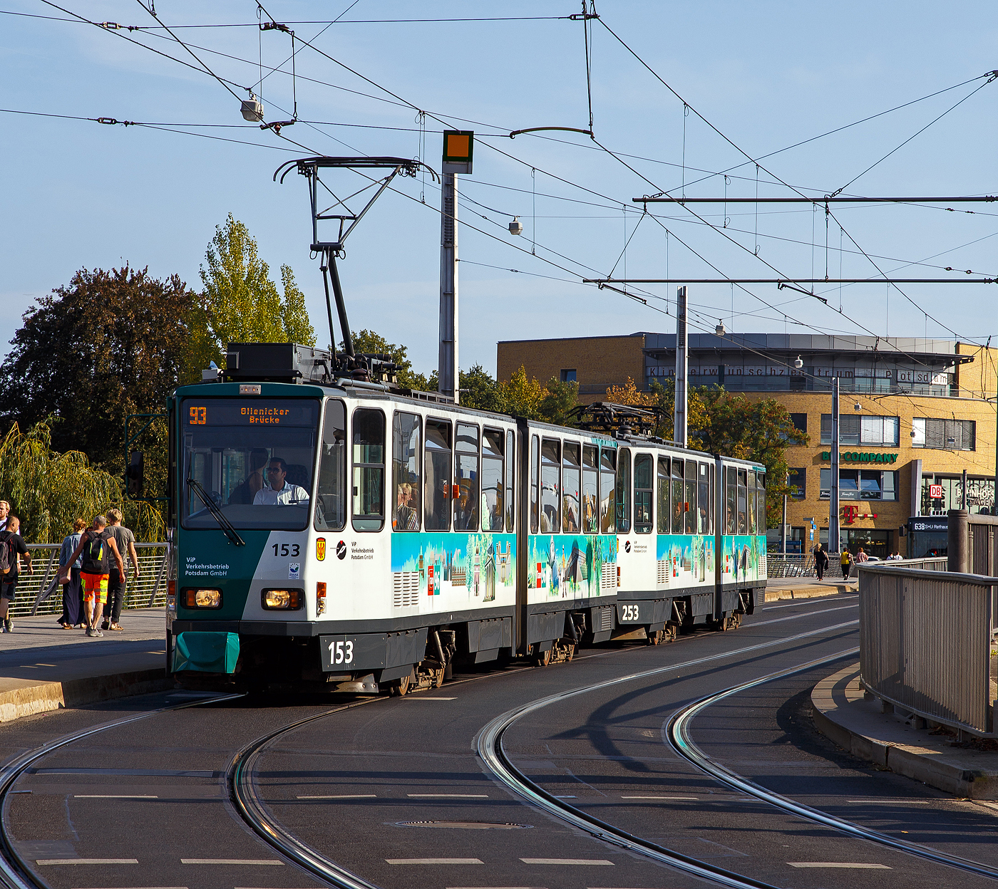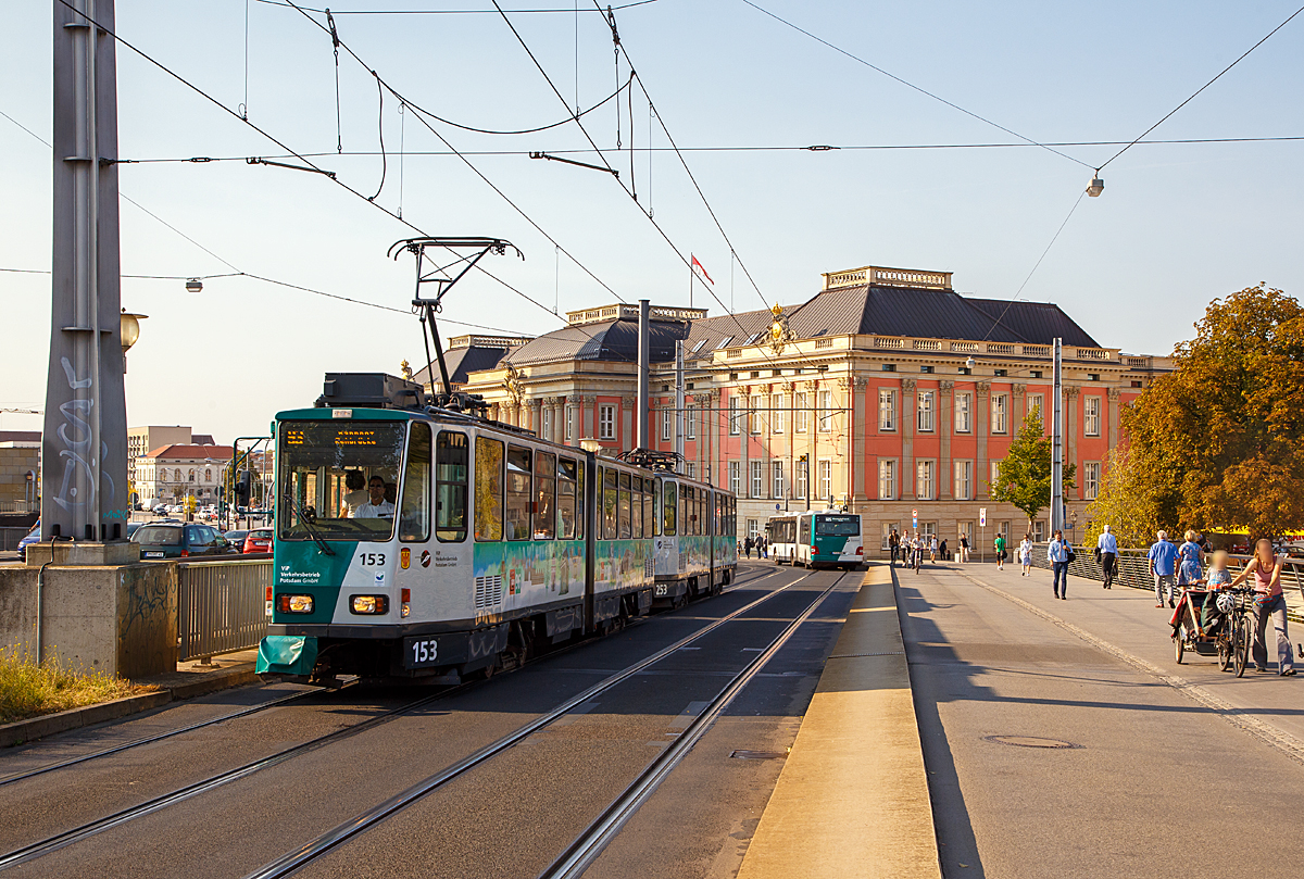 Die beiden gekuppelten Einrichtungs-Kurzgelenktriebwagen (modernisiert) 149 "Szeged" und 249 der ViP (Verkehrsbetrieb Potsdam GmbH) vom Typ ČKD Tatra KT4D-MCG verlassen am 19.09.2018 Potsdam Hauptbahnhof in Richtung Babelsberg.