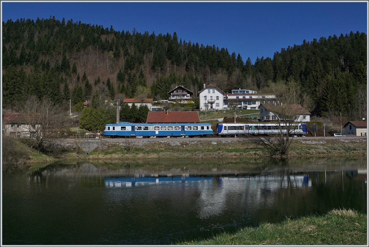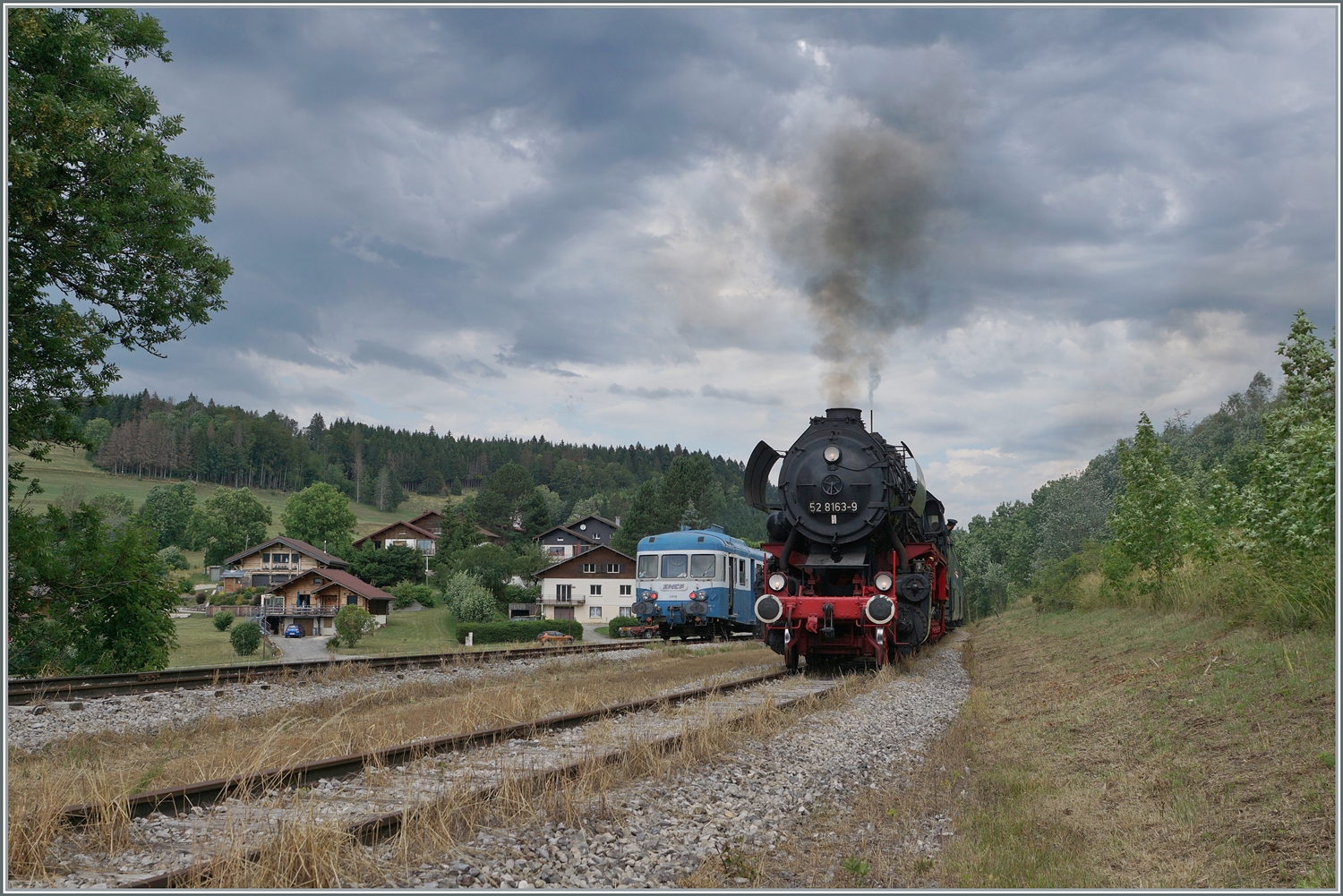 30 ANS CONI'FER /30 Jahre Coni'Fer - So viel Verkehr gab es wohl hier seit gut 110 Jahren nicht mehr! Der X 2816 der Association l'autorail X2800 du Haut-Doubs wartet im mir bis anhin unbekannten Kreuzungsbahnhof der Coni'Fer von Le Touillon auf den von der 52 8163-9 geführten Gegenzug. Die Kreuzung der beiden doch so verschiedenen Züge war für mich der fotografische Höhepunkt des Jubiläums, und wie man sieht zückte aus das Fahrpersonal des X 2800 die Kameras.