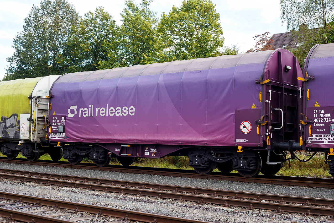 Vierachsiger Drehgestell-Flachwagen mit verschiebbarem Planenverdeck und Lademulden für Coiltransporte, 37 84 4669 587-6 NL-ATRR der Gattung Shimmns, des französischen Waggonvermieters ATIR-RAIL (Paris), vermietet an ArcelorMittal S.A., 22 Mai 2024 im Zugverband bei einer Zugdurchfahrt in Wilnsdorf-Rudersdorf.