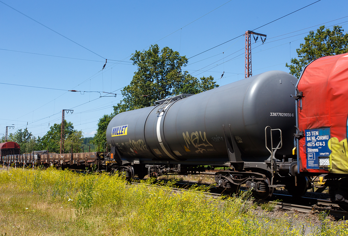 Vierachsiger-Drehgestell Kesselwagen Zacs der Vermietungsfirma ERMEWA eingestellt als 33 RIV 87 F-ERSA 7866 852-9, am 22.08.2015 im Zugverband bei der Durchfahrt im Bf Betzdorf/Sieg.